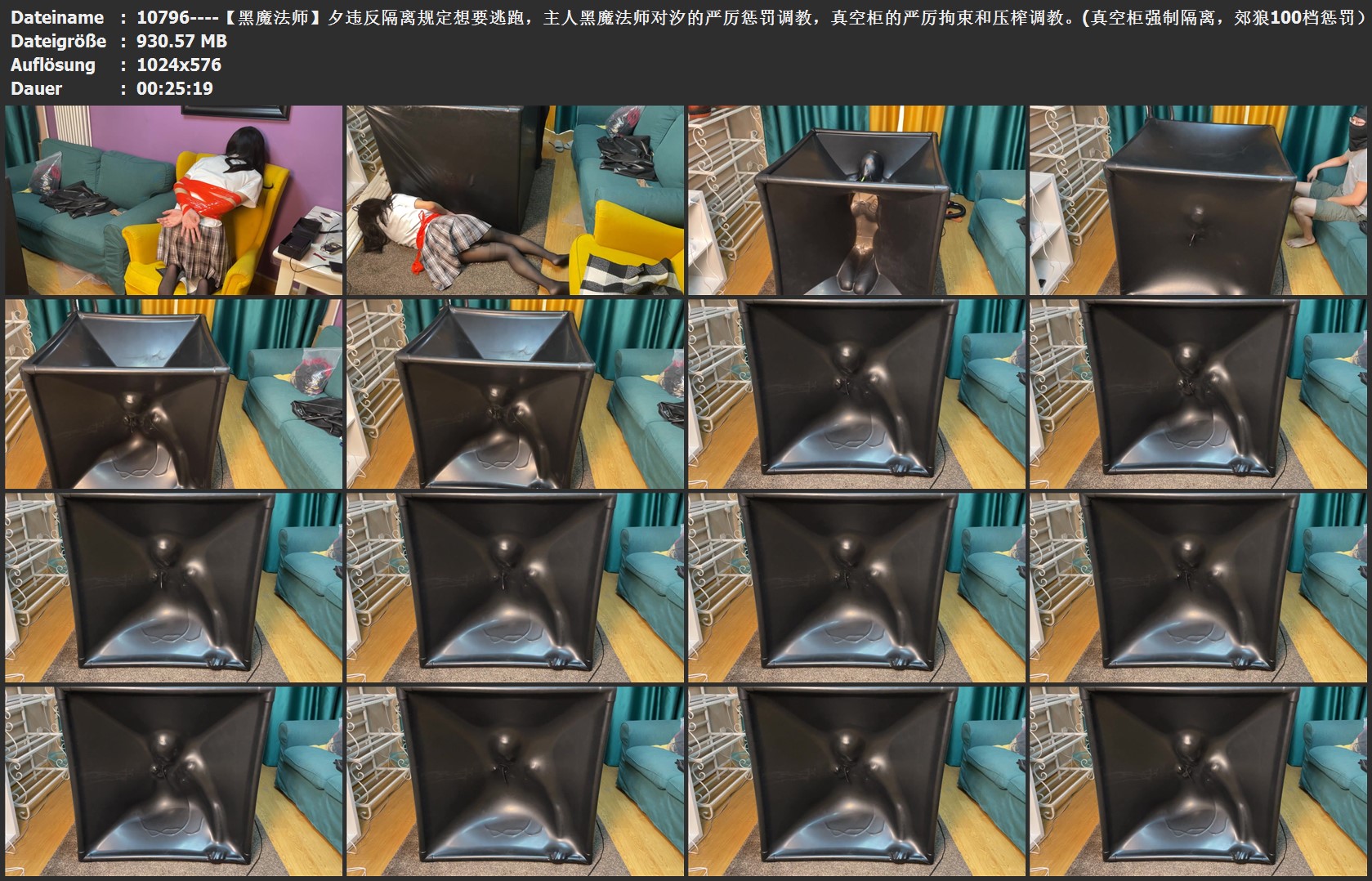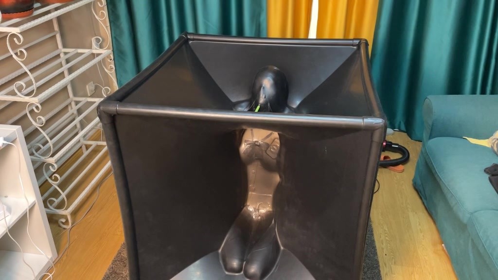 因为隔离不能离开的汐,想要偷偷跑出去,没想到被主人黑魔法师发现,黑魔法师制止了汐,为了惩罚汐想要跑出去的行为,黑魔法师把汐的手臂反曲到身后,紧紧用红色胶带绑好。没想到汐还是挣脱了捆绑想要逃跑,于是黑魔法师把汐绑好以后带到了黑色乳胶真空柜旁边,黑魔法师把汐装进了真空柜里面,装进柜子里面以后,黑魔法师开始用吸尘器排出真空柜的空气,吸尘器把柜子里面排成真空,变成真空的乳胶柜的乳胶贴在了汐的身体每一寸皮肤,紧紧粘在上面。随后黑魔法师拿来了电击器贴在汐的身上,开启开关以后,电流和震动开始刺激汐的身体。汐只有一个吸管可以呼吸到空气,汐被惩罚跪在真空柜里面,同时接受乳胶,电击器的三重调教。汐被紧紧困在里面,无论怎么挣扎都逃不出去,很快就被三重调教折磨得精疲力尽,黑魔法师把汐折磨了十几分钟以后,关闭了吸尘器。就在汐以为调教已经结束的时候,黑魔法师把汐换了个姿势再次打开吸尘器,乳胶再次包住了汐的身体,黑魔法师加强了电击器的强度,开始了新一轮的调教,汐一只手撑着乳胶柜的边缘,被包起来动弹不得,进行放置压榨调教,强迫汐对自己的行为反省认错。