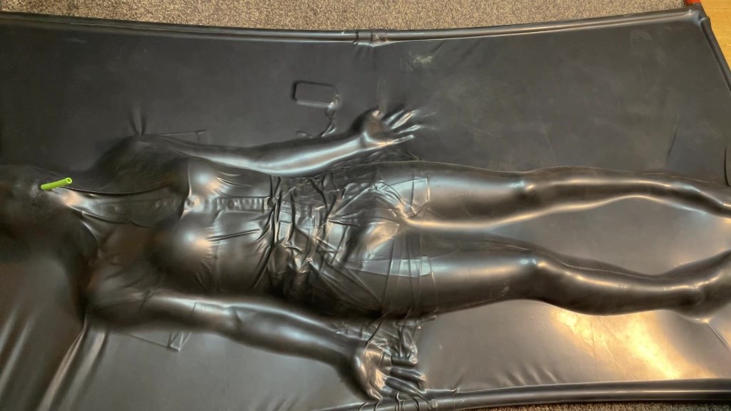 黑魔法给汐设计了一次挣脱拘束的挑战,用红色绳子绑住汐,黑色眼罩蒙住眼睛,坐在沙发上,穿着黑丝袜的右腿被黑魔法师用红色绳子把大腿和小腿卷曲绑起来,左腿的脚踝和沙发的一个脚用绳子绑在一起,双手也被交叉绑在胸前,汐只能坐在沙发上小幅度的挣扎,开始进行挣脱绳子的脱缚挑战,黑魔法师看着汐在沙发上挣扎了十几分钟,汐仍然没有挑战成功,于是黑魔法师把挑战失败的汐装进了黑色的乳胶真空床里面,用真空床对汐进行惩罚,用吸尘器把真空床里面的空气抽出排成真空状态,汐被真空床牢牢吸附在里面,乳胶把汐拘束在里面,勾勒出身体的轮廓。黑魔法师看着被困在真空床里面的汐无助的挣扎,并且只给汐一根吸管呼吸新鲜空气,然后再开始给汐的身体进行按摩,反复刺激汐的敏感部位。等到汐被折磨调教得精疲力尽以后,黑魔法师再拿出一个新的,开始隔着真空床的乳胶对汐的身体展开新一轮的刺激,紧紧贴着汐的私密部位,反复进行按摩。