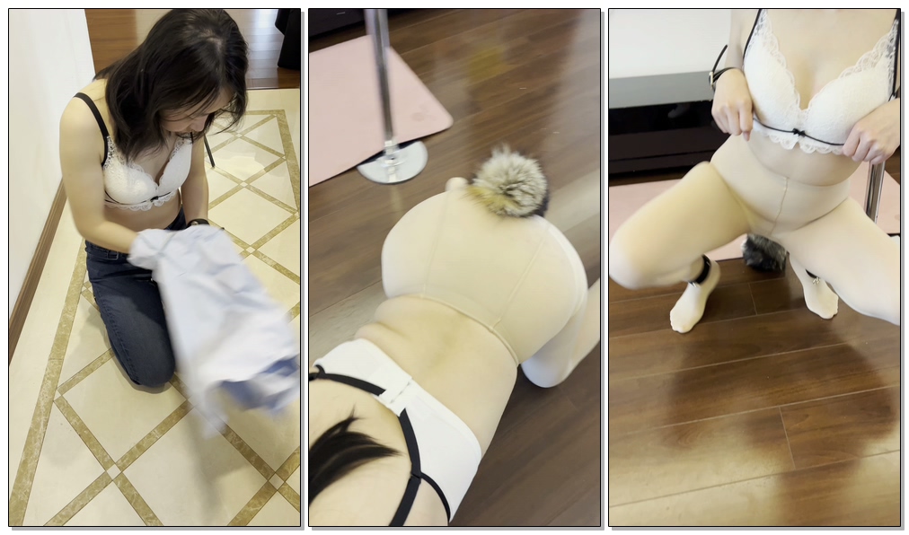 主人开门,母狗用犬叫回应主人,把脚踩在母狗头上,母狗犬叫求饶并且摇晃屁股讨好主人。主人让母狗一分钟之内脱下衣物,犬趴在地上,主人给母狗佩戴好项圈,并栓上牵引绳。装上内置[X_X],再装上尾巴。