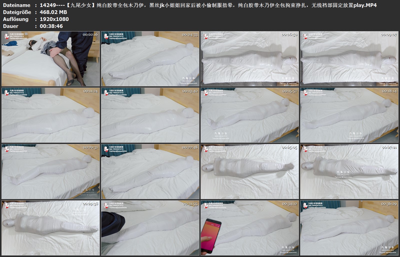 【九尾少女】纯白胶带全包木乃伊,黑丝jk小姐姐回家后被小偷制服捂晕,纯白胶带木乃伊全包拘束挣扎,无线裆部固定放置play