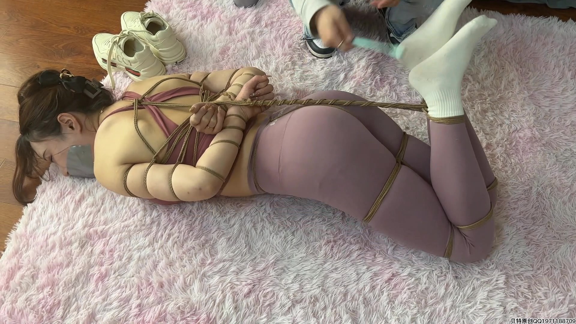 女贼(安慈扮演)进入屋中盗窃被男主人发现,被男主人反剪双人摁倒在地上,男主说:小毛贼敢来我这偷东西?女贼说到:大哥,我只是走错房间了。男主说:不管怎样先把你绑起来,再审一审。于是,让女贼双脚并拢跪在地上,接着用麻绳捆绑她双人,捆绑完双手后,将女贼押到房子,推倒在床上,接着捆绑她腿脚。捆绑腿脚完毕后[隐藏文字,购买后可见],将其驷马倒攒蹄。捆绑完毕为防止女贼叫喊,男主拿来一块毛巾,揉成一团捏住女贼脸颊让她张大嘴后,将毛巾塞入嘴巴里,接着用胶带缠绕封上。捆绑堵嘴后,要确定模特能发出多少声音。还要脱了她的鞋子用挠她脚心及全身。女贼发出呜呜呜声音。TK玩弄一会,男主想听不同的堵嘴物能发出怎样的声音,解开女贼胶带,掏出毛巾,然后给她戴上口球接着继续挠,女贼呜呜呜呜。男主越玩越上头,女贼也挣扎厉害,所以男主决定给她绑个动弹不得的,拿来刀子威胁她说:松开你的绳子,不要乱动,我玩够就放了你。女贼点头呜呜呜答应。接着男主解开她的绳子,又拿来白色绳子将她欧式直臂缚捆绑起来,腿脚还是一样,接着欧式驷马倒攒蹄,接着捆绑头发里,接着用胶带缠绕捆绑好。女贼被紧紧捆绑好后动弹不得,只能发出呜呜呜声音。男主将她侧身翻几次后,又全身TK她,女贼只能呜呜呜。一会男主玩累,检查了女贼身上绳子是否结实后,又用女贼鞋子让她闻了闻把她放置床上后离开,女贼在床上挣扎