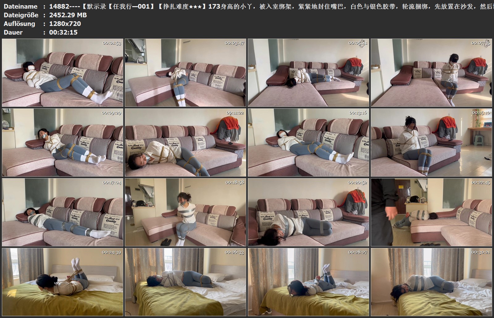 【任我行—001】【挣扎难度★★★】173身高的小丫,被入室绑架,紧紧地封住嘴巴,白色与银色胶带,轮流捆绑,先放置在沙发,然后驷马捆在床上,想跑?没门~