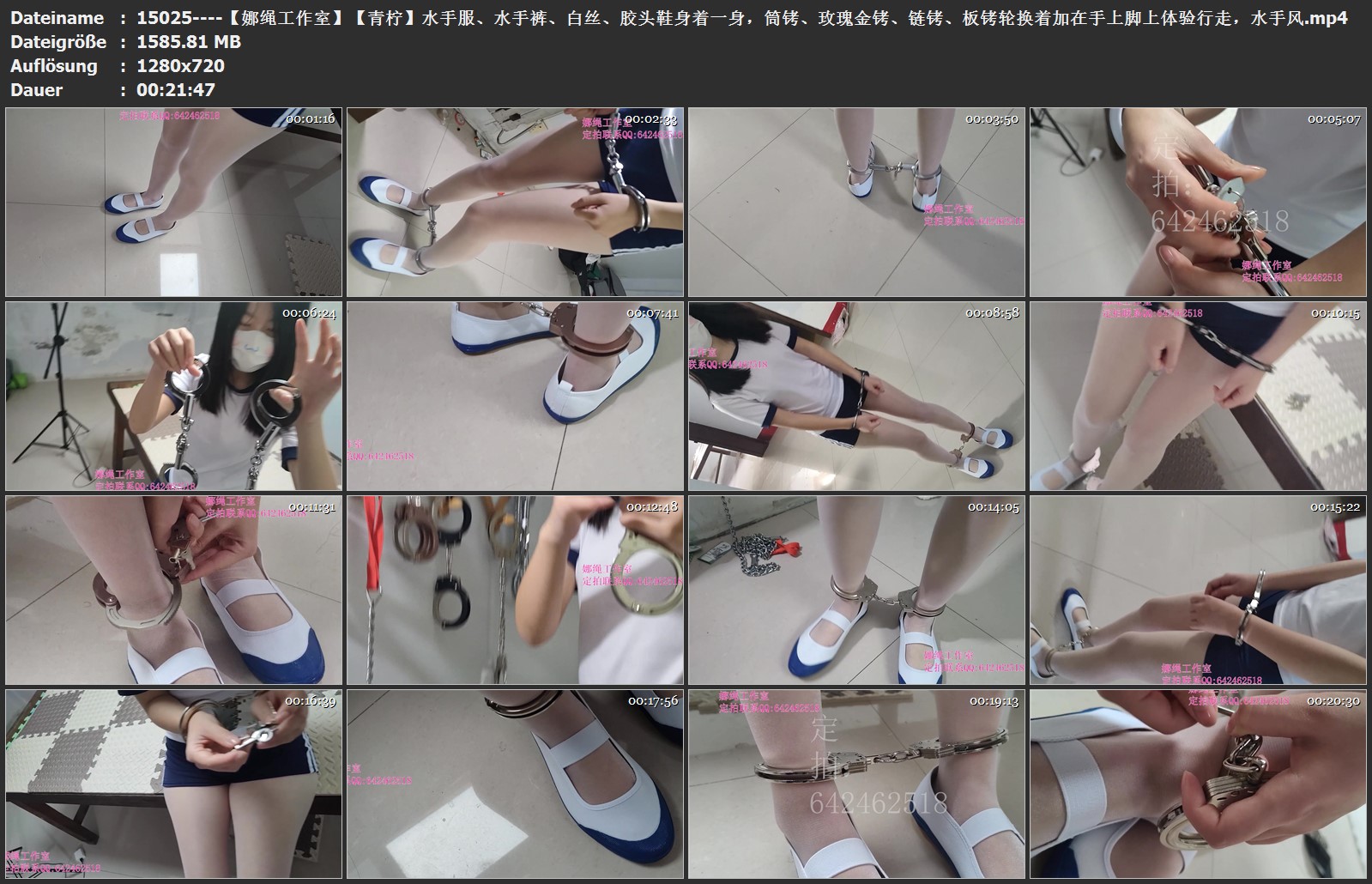 水手服、水手裤、白丝、胶头鞋身着一身,筒铐、玫瑰金铐、链铐、板铐轮换着加在手上脚上体验行走,水手风的青柠自己一个人体验了不同的镣铐加上身,体验被链铐束缚住行走的感觉。自己上铐,自己解铐,全程让青柠自己一个人动手,她的主人没有参与,这确实让青柠成长了一点。但是镣铐的后面,青柠还是经验缺失,用了好长时间才打开脚上的链铐