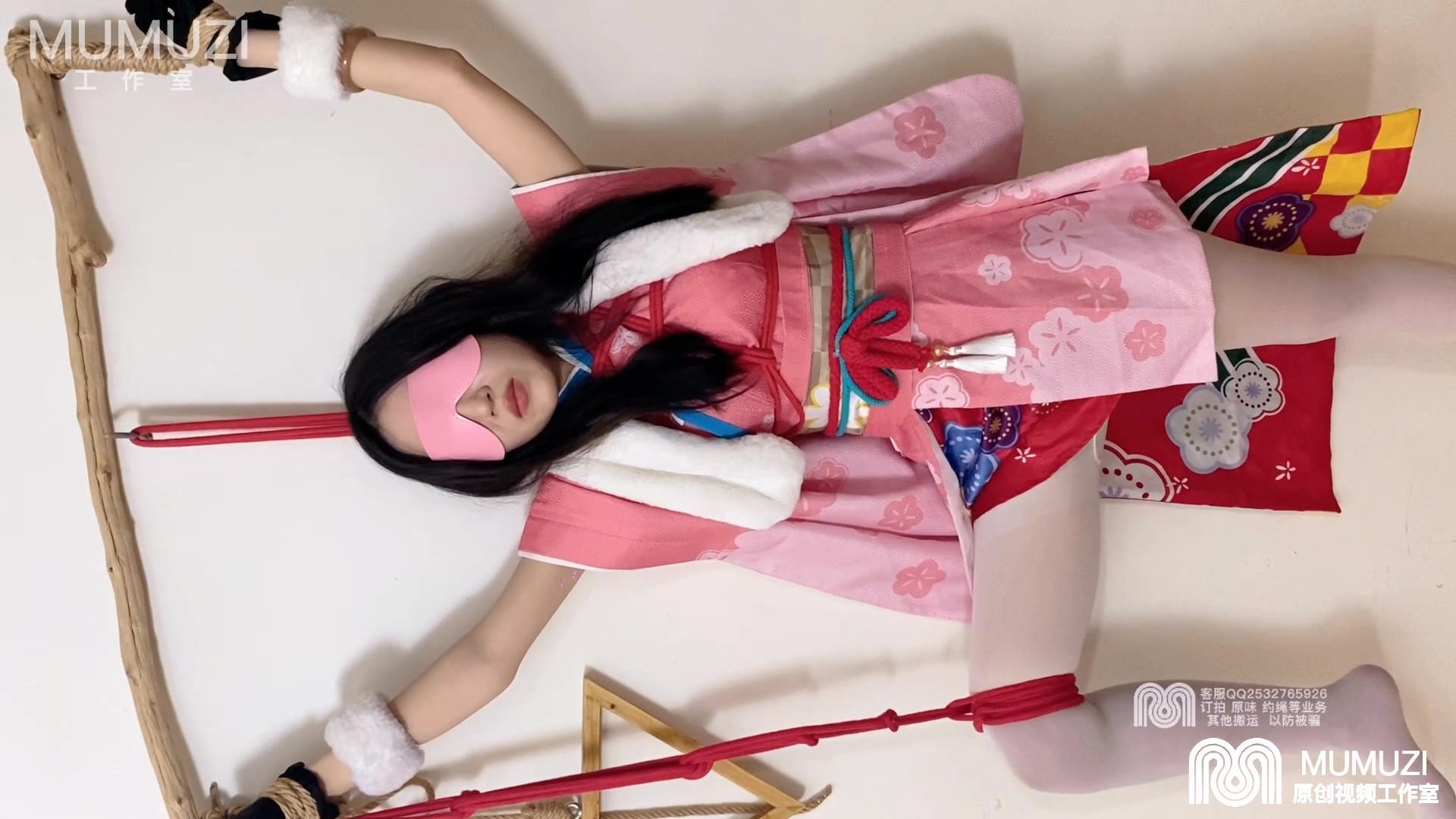 桃子COS幼贞双手被绑在木架上,单脚被吊缚着,正在挣扎的桃子被栗子拿来眼罩蒙住眼睛,看不见的桃子