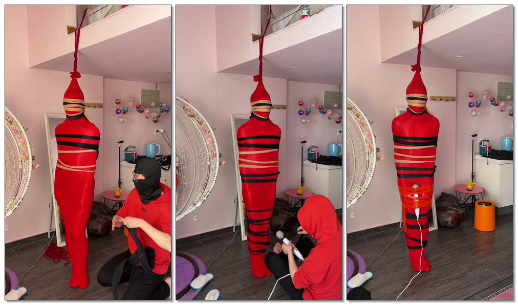 这一次黑魔法师采用了站缚的方式,M被包裹在丝袜里面,强迫站在原地接受调教。在黑魔法师的房间里面,有一个被站缚的M,黑魔法师先用红色的丝袜将M包裹起来,然后吊住一端使M无法弯腰,只能保持站姿,接着用十几条丝袜捆绑在M的身上,使m全身上下动弹不得,只能来回扭动身体。捆绑好以后,黑魔法师将[X_X]固定在m的双腿之间开始按摩,因为[X_X]也被丝袜固定在M身上,不论怎么扭动自己的身体也躲不开,只能乖乖忍受[X_X]的刺激。榨出来一次以后,黑魔法师拿出第二根[X_X]一起刺激M的身体,这一次的反应更加剧烈,两根[X_X]上下夹击,将M折磨到无法忍受,M被调教得精疲力尽,黑魔法师才收起了[X_X]离开房间。