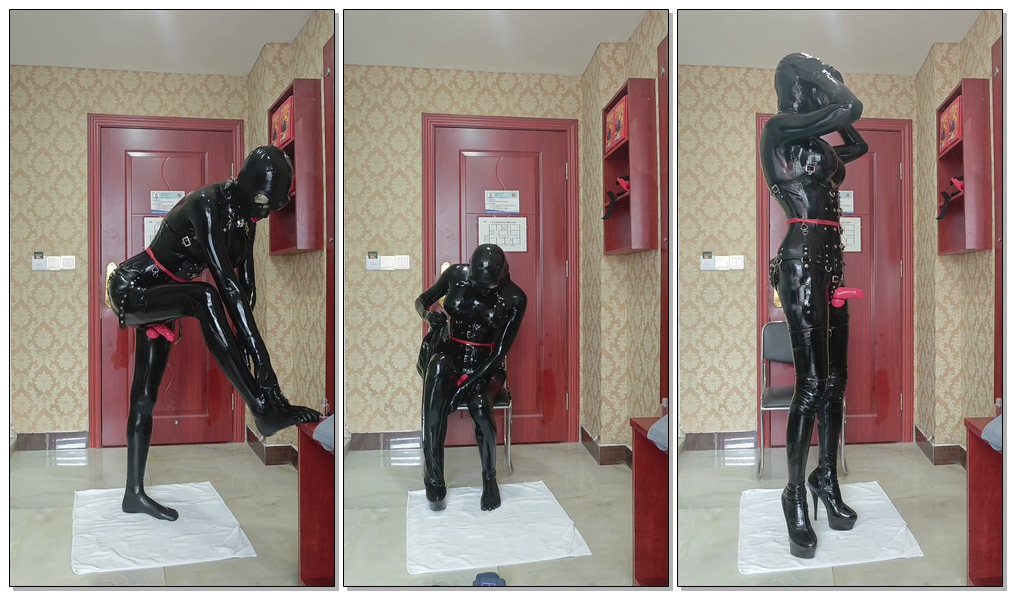 【kigurumi】呼吸控制 被黑色胶衣紧紧包裹住的娃娃,绑在浴缸里,头壳下是rf乳胶头套红嘴无法说话,将被怎么玩弄呢~