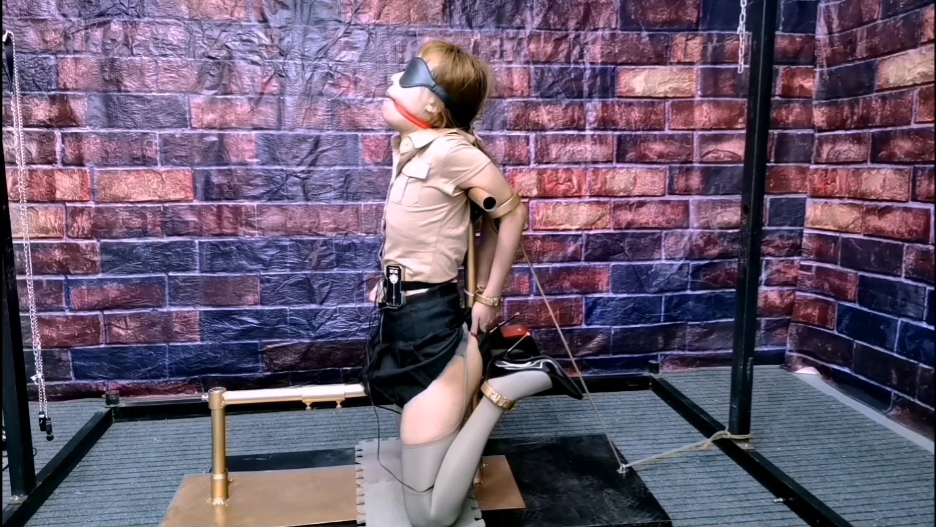 【缚心室】肉丝双马尾女学生体验新玩具炮机椅,后手直臂固定连头