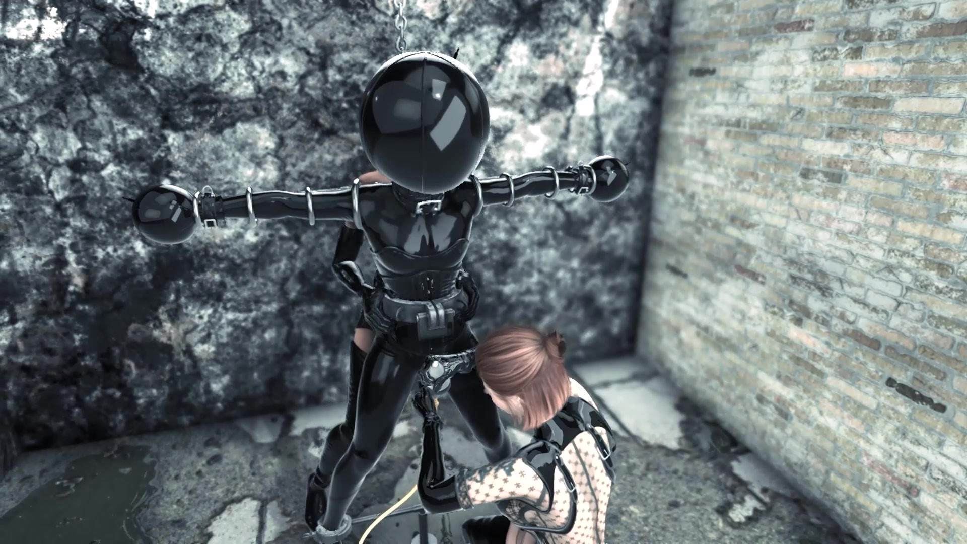 《恋物母与子6-牢狱榨汁收集调教篇》,恋物拘束CG动画剧情短片,乳胶衣、马具口球、失能充气手套、全包充气球头套、G钩T字支架吊缚固定