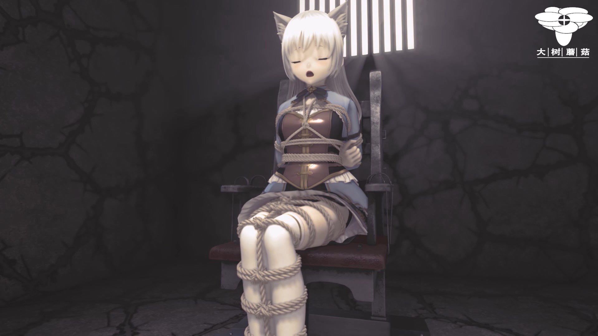 【大树菇娘】《黛薇奈缚置调教记B》,黑暗风国产CG动画作品,西式二次元风格美少女监狱刑椅拘束放置+AM棒+炮机调教CG失禁