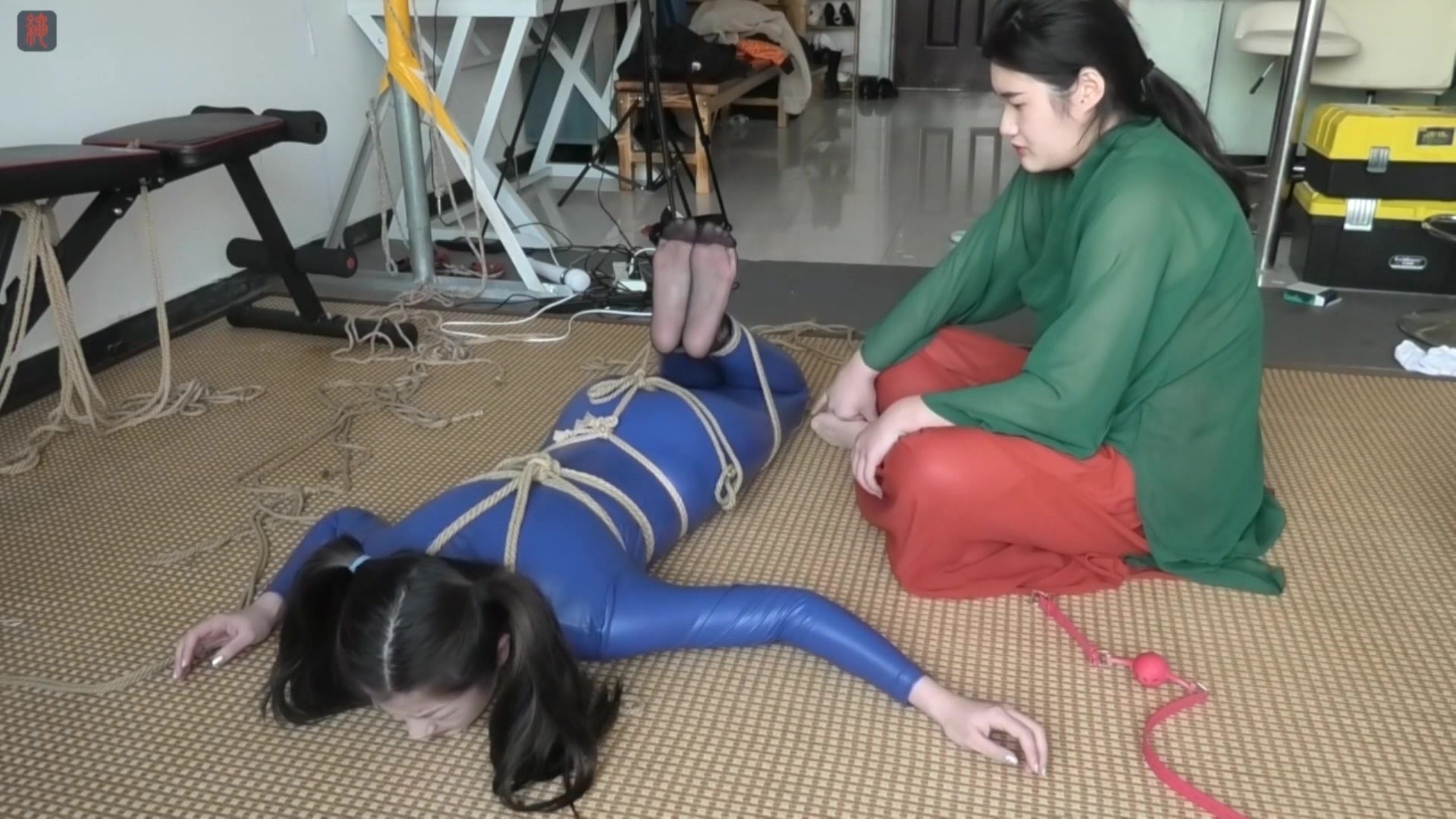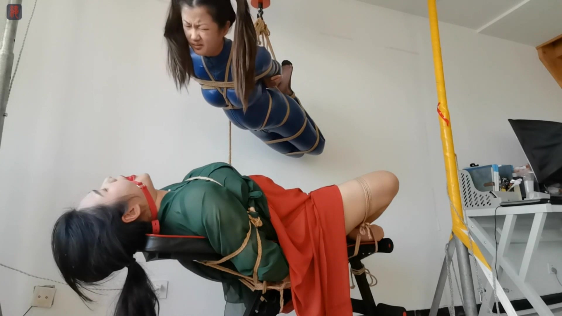 【绳之韵】羽灵、雨桐双人绳戏:羽灵蓝胶衣、水晶黑丝悬吊、雨桐汉服、仰面M缚,双人叠罗汉、强高、TK游戏