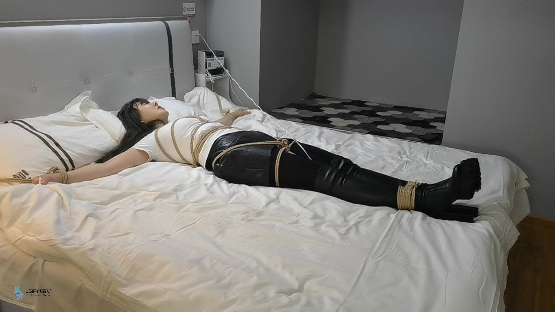 房东重新模特的腿捆在一起,开始对着模特身上就是一顿摸胸,手指慢慢拂过模特的[X_X]。模特忍不住发出了性感的声音。模特双腿不断挣扎,但怎么挣扎都比不过房东的力气。房东玩爽了之后模特用尽自己的力量想站起来逃脱,但是鞋跟太高,地板这么滑,模特怎么都站不起来,挣扎了几分钟之后好不容易站起来想一步步逃走,但是高跟鞋的声音让房东给听到了,生气的房东抱着模特把她带到了房间里,他将模特大字缚捆在床上,随后拿来瑜伽棒对着模特就是一顿输出,下面瑜伽棒手上也不闲着,模特无力抵抗。最后房东玩爽了,换了种捆姿,将模特两腿跟着[X_X]绑在一起,只剩下四肢被绑,动弹不得的模特,躺在床上不停地哀嚎