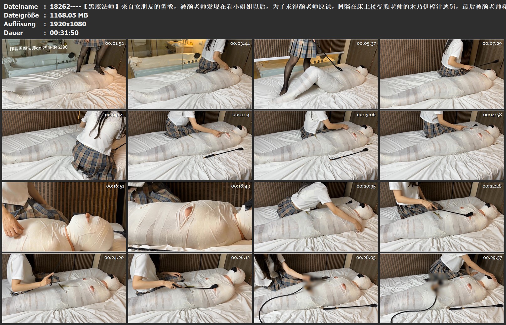 M正在房间里面用手机看抖音的小姐姐,没想到这个时候颜老师走进来了,颜老师发现M在看小姐姐,于是要检查手机,既然这么喜欢看小姐姐,为什么不看颜老师的?敢去看别的小姐姐,必须要给你一点惩罚长长记性。颜老师把M按在床上弄晕,然后拿来了一大堆的绷带,将M趁着昏迷的时候包裹成一个绷带木乃伊,并且把M的嘴巴也用胶带封堵,只留出一个鼻子可以呼吸。被包裹成木乃伊的M苏醒过来,发现自己被颜老师包裹成木乃伊动弹不得,颜老师开始正式对M实行惩罚,抬起穿着黑丝袜的脚踩上M的脸,踩扁了鼻子,只能呼吸来自颜老师丝袜脚底的气味,无论怎么反抗都被牢牢踩着鼻子进行气味控制。被颜老师踩着进行控制以后,颜老师终于抬起脚,但是紧接着把M当作脚垫一样踩在脚下反复蹂躏,在M的身体上来回碾踩,把M踩得连连呻吟无法躲避,身体被踩以后,颜老师拿来了板子和牙刷,开始给男M解开上半身的绷带,以为惩罚结束的男M发现现在才刚刚开始。颜老师只解开了男M胸口的绷带,然后用板子开始给M身上进行拍打,对M进行鞭打惩罚,不断鞭打使M开始扭动身体尝试躲避,但是变成木乃伊的身体根本无法大幅度运动,小范围蠕动反而让颜老师的调教欲望大增,开始进一步的调教,使用牙刷开始反复对M的胸部进行折磨,使用牙刷造成的刺激还不足,颜老师拿来了一个梳子,用牙刷和梳子双管齐下对包裹成木乃伊的M进行更加刺激的调教。为了把M压榨到完全没有力气,颜老师拿来了电动的杯子固定在M的下半身双腿之间,并且启动杯子,把M刺激得更加舒服,杯子在身体上反复进行运动,而且越来越剧烈,但是无法反抗的M很快就被杯子压榨得毫无抵抗力量,即便M已经缴械投降,杯子也没有停下来,不停在M的两腿之间进行强烈的压榨,反复在兴奋和疲惫之间被杯子刺激,最终在颜老师的监视下被杯子压榨到失去意识。