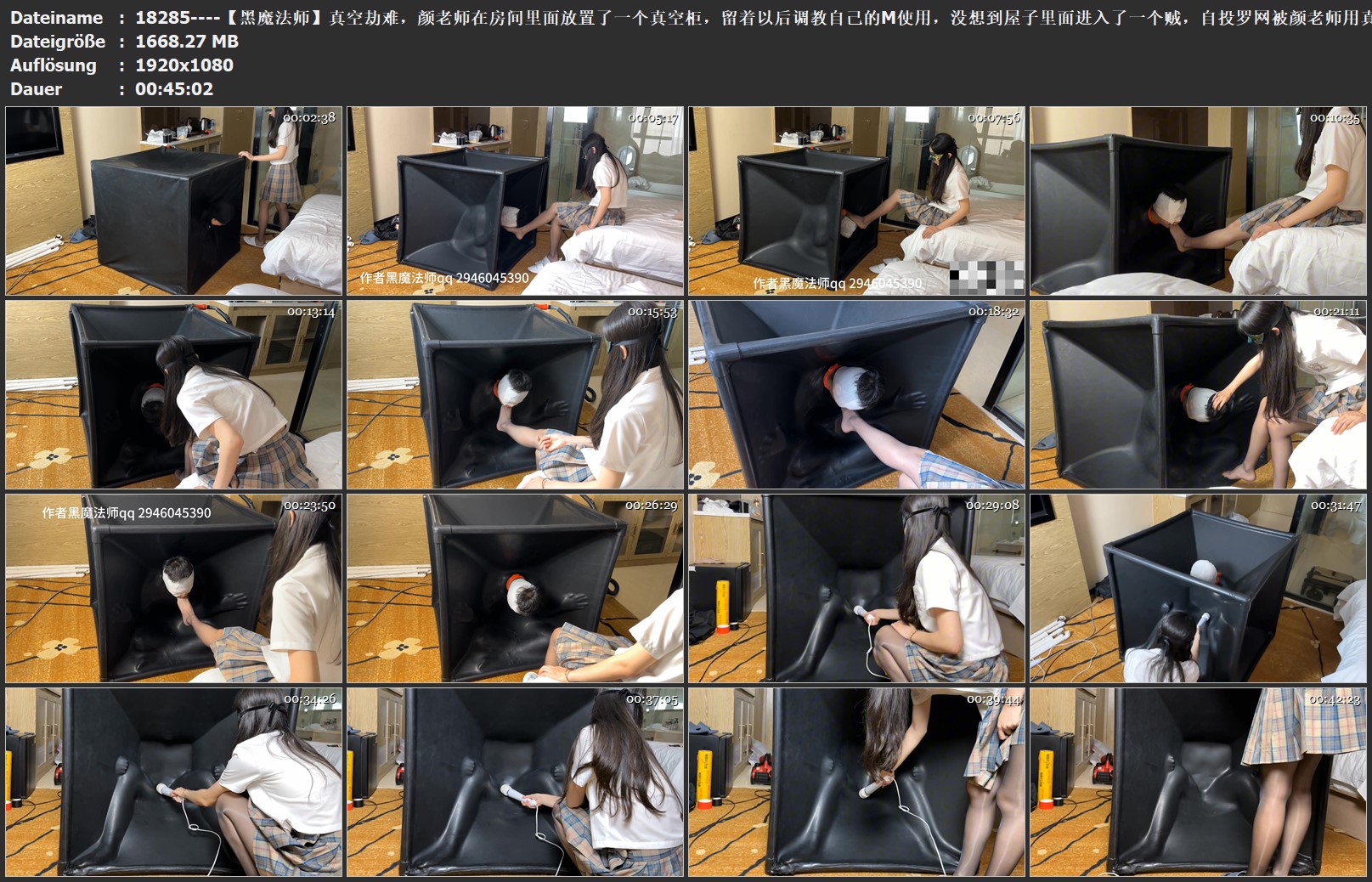 颜老师购买了一个真空柜,将这个真空柜放在家里,然后便外出了。没想到这个时候颜老师的家里进入了一个笨贼,想要偷走颜老师家里的东西,但是这个时候发现颜老师居然回到了家里,这下笨贼慌张了,在房间里面寻找可以躲藏的地方,情急之下这个笨贼发现了放在地上的真空柜,于是躲了进去。没想到,颜老师正好想试试真空柜的性能,便启动了真空柜的排气功能,这才发现自己的真空柜里面还藏了一个人!发现真空柜在排气缩小的贼连忙出声求饶,他可不敢继续待在这个柜子里面了,被真空柜固定住以后连忙出声喊停,这才引起了颜老师的注意,笨贼在柜子里面向颜老师求饶放他出来,但是颜老师怎么会放过这么好的机会,第一次有人送上门来主动钻进真空柜里面接受调解,于是颜老师继续使用真空柜的排气功能,把贼彻底固定在真空柜里面准备进行调教,将这个被真空柜困住的笨贼调教成自己的奴隶。M被真空柜固定住,颜老师架起自己的黑丝腿放在M的头上当作自己的脚垫,M想不到自己偷东西居然被抓住,还要承受被调教的惩罚,但是能够成为美丽的颜老师的脚垫就是荣幸。颜老师开始思考怎么进行对他的调教。这么笨的贼就应该给她洗脚,成为清理脚部的奴隶,于是颜老师将自己的丝袜脚塞进M的嘴巴里面,滑嫩的黑丝美脚塞入M的嘴里,强迫M舔舐她的丝袜脚进行清洗,嘴巴被颜老师的丝袜脚填满,只能被迫用自己的嘴巴和舌头为颜老师洗脚,颜老师的丝袜脚在M的嘴里面来回捣弄,让M不得安宁,并且让嘴里面反复品尝颜老师丝袜脚的味道。被固定在真空柜里面的M还不老实,在里面不断挣扎,但是真空柜让他动弹不得,只能乖乖给颜老师当一个用嘴巴清洗脚部的奴隶。颜老师见这个M这么不听话,于是决定把他继续关在真空柜里面进行奴役训练,抬起一只脚踩着M的头向下压,另一只脚继续塞着M的嘴巴,并且半个脚都插进M的嘴巴里面进行扩张,强行深入M的嘴巴里面,让M得不到一点休息,颜老师强迫M用嘴巴将自己的两只丝袜脚都用嘴巴洗干净以后,颜老师看见M的两腿之间居然有了反应,决定进行进一步的调教,于是竖起真空柜,颜老师拿过[X_X]开始隔着真空柜对M的两腿之间进行刺激,把M刺激得发出叫声,即使把M榨出几发也没有停下,直到被包裹在真空柜里面的M完全虚脱才停下来。