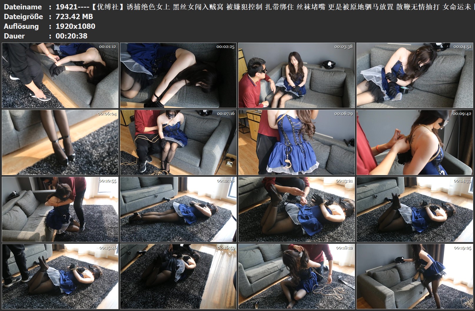 诱捕绝色女上 黑丝女闯入贼窝 被嫌犯控制 扎带绑住 丝袜堵嘴 更是被原地驷马放置 散鞭无情抽打 女命运未卜