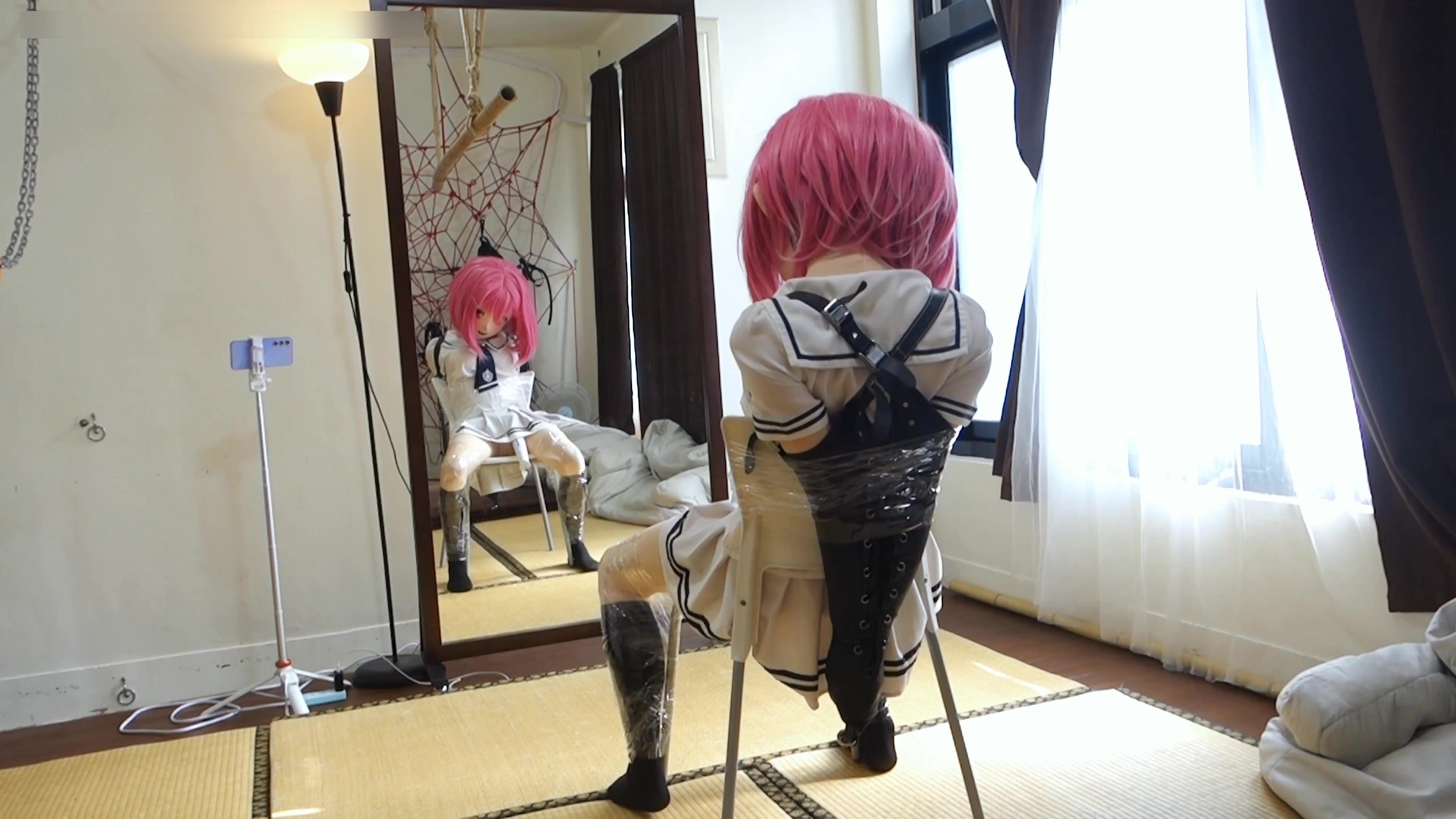 双手在背后被单手套拘束,身体被胶膜捆绑在椅子上,已经完全无法动弹,只能被[X_X]玩弄,结果还被连同椅子丢进了真空袋里,被狠狠的压缩啦~~