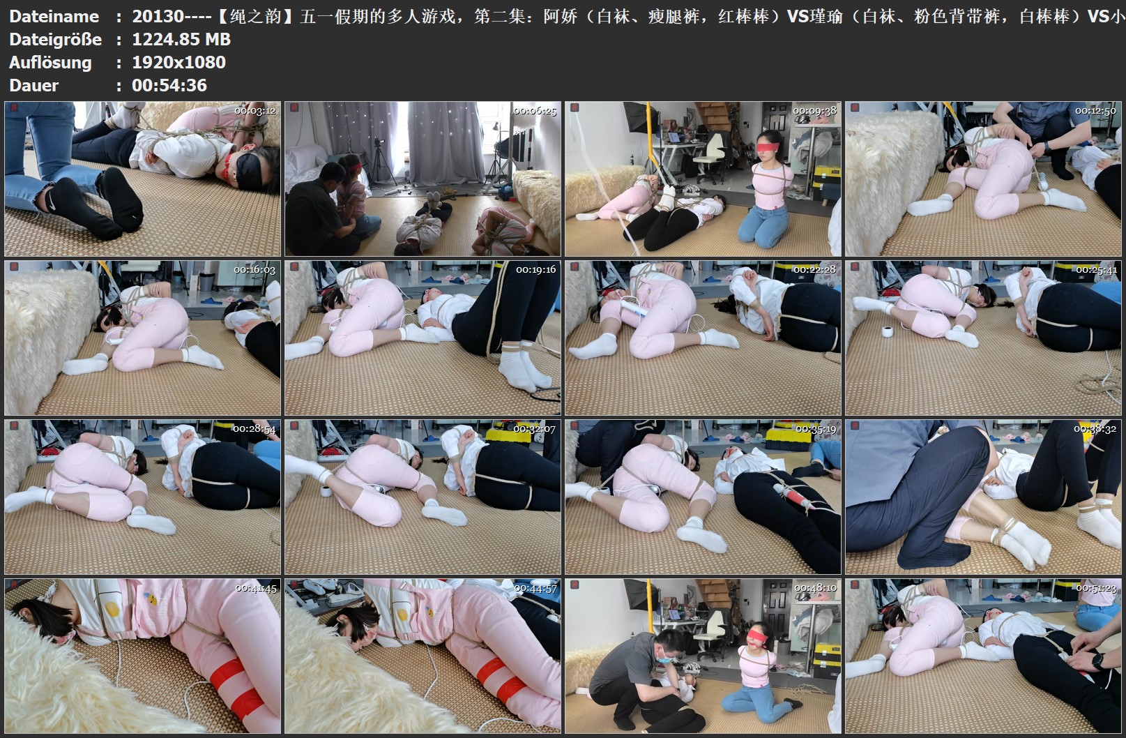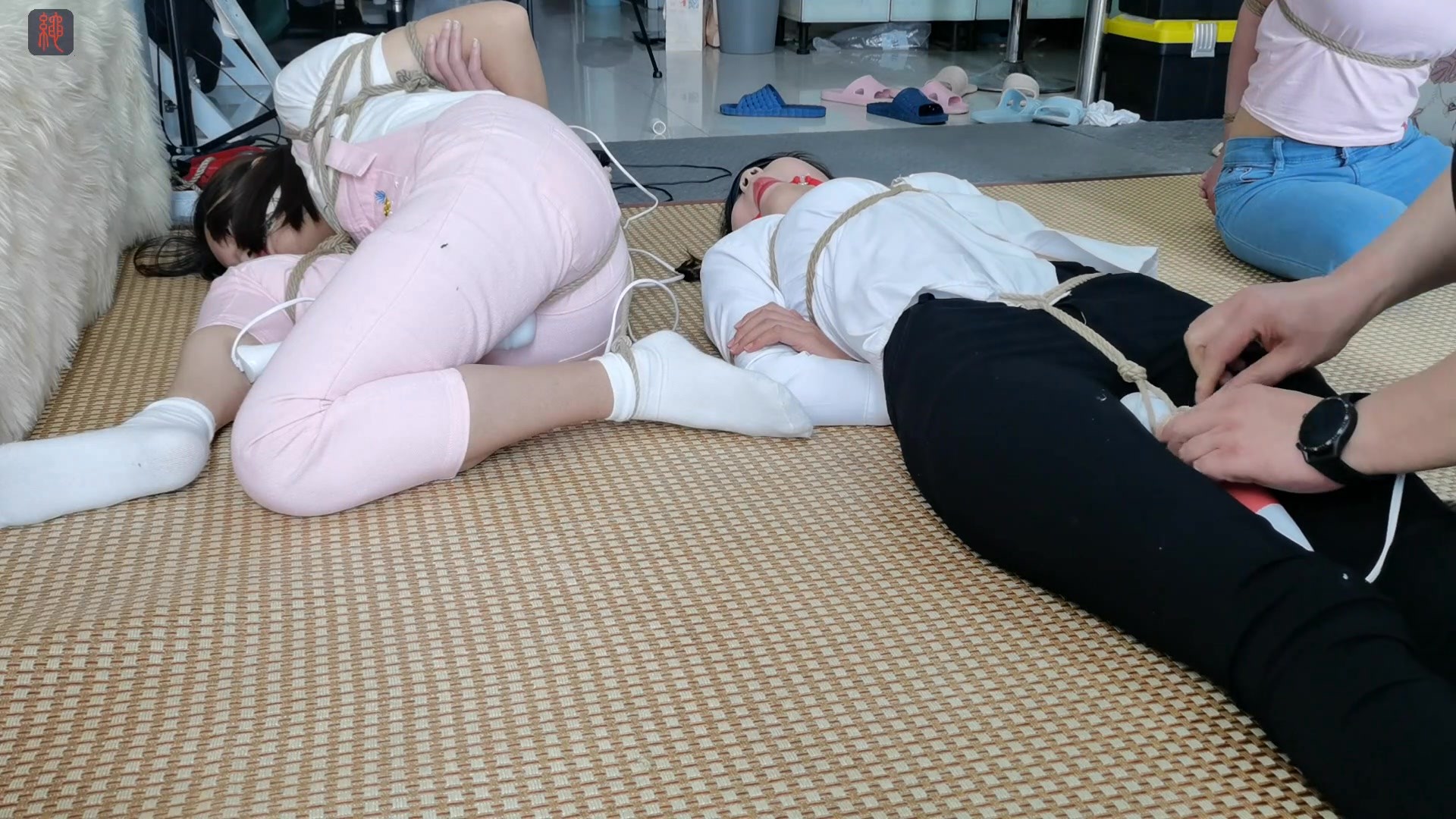 【绳之韵】五一假期的多人游戏,第二集:阿娇(白袜、瘦腿裤,红棒棒)VS瑾瑜(白袜、粉色背带裤,白棒棒)VS小凡(紧身牛仔裤、黑袜袜),三女捆绑,不同的绑法和封堵,一样的蹂躏...