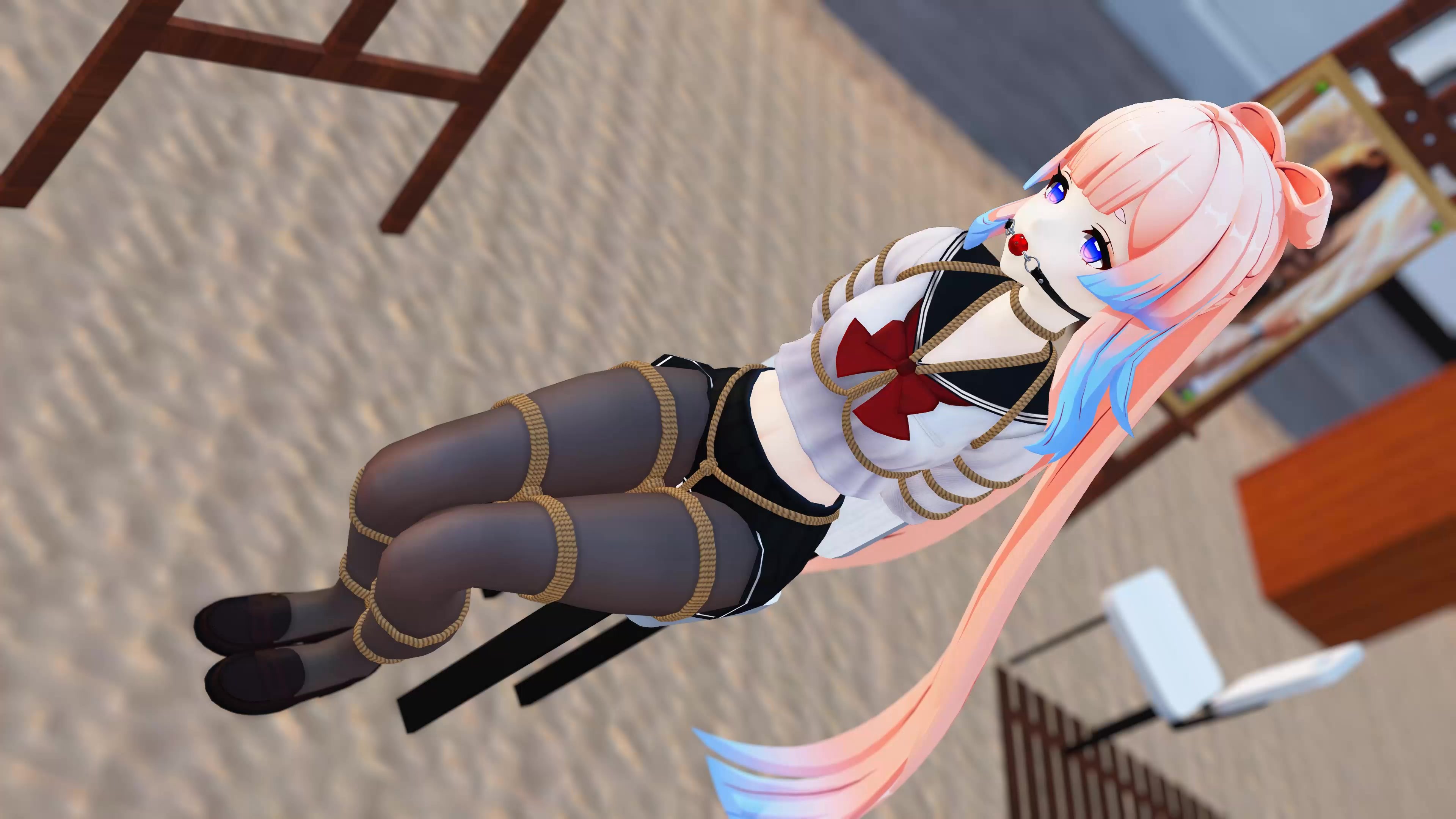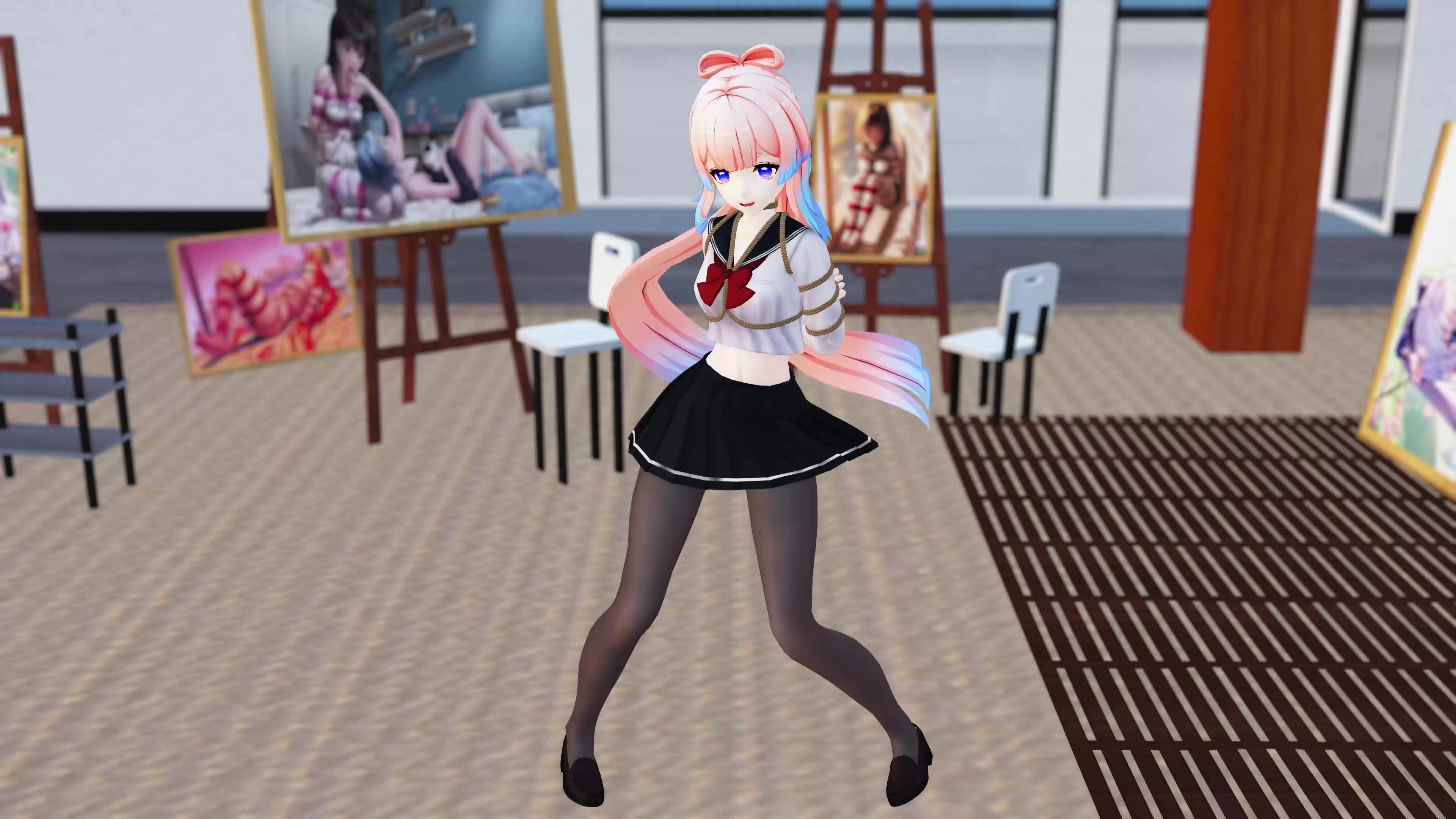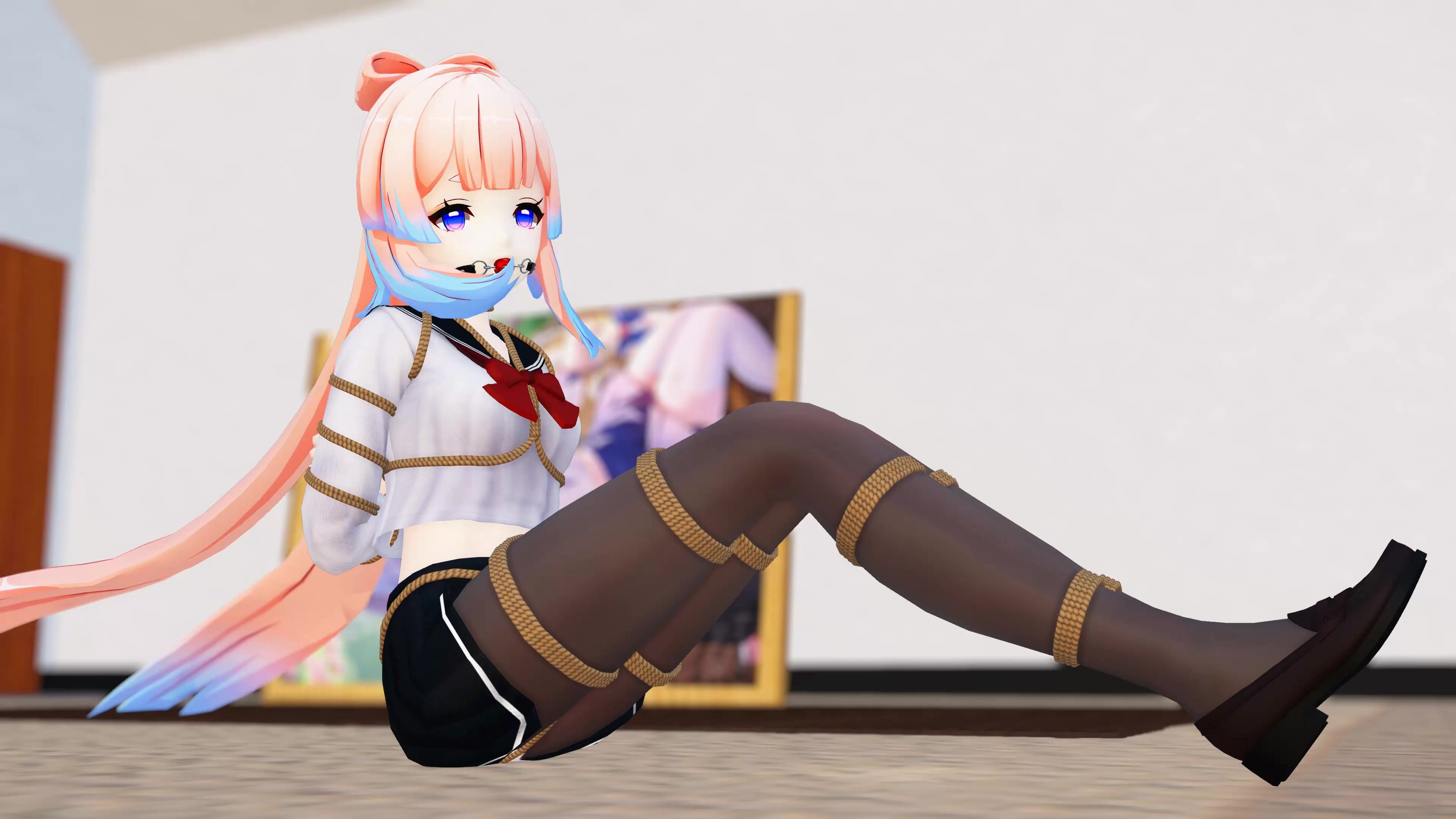 比较现代的风格,心海穿着JK装,裙子上绑着股绳,跳舞+站缚+坐地缚+椅子缚