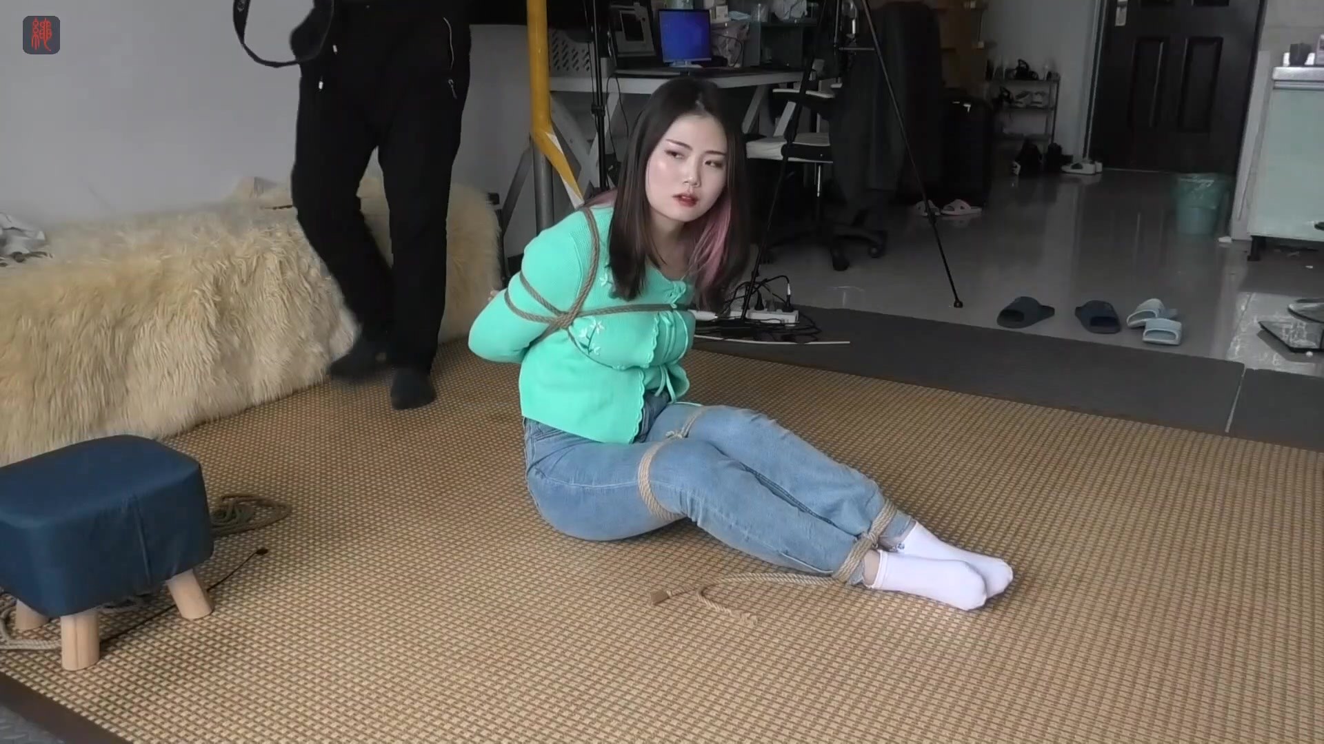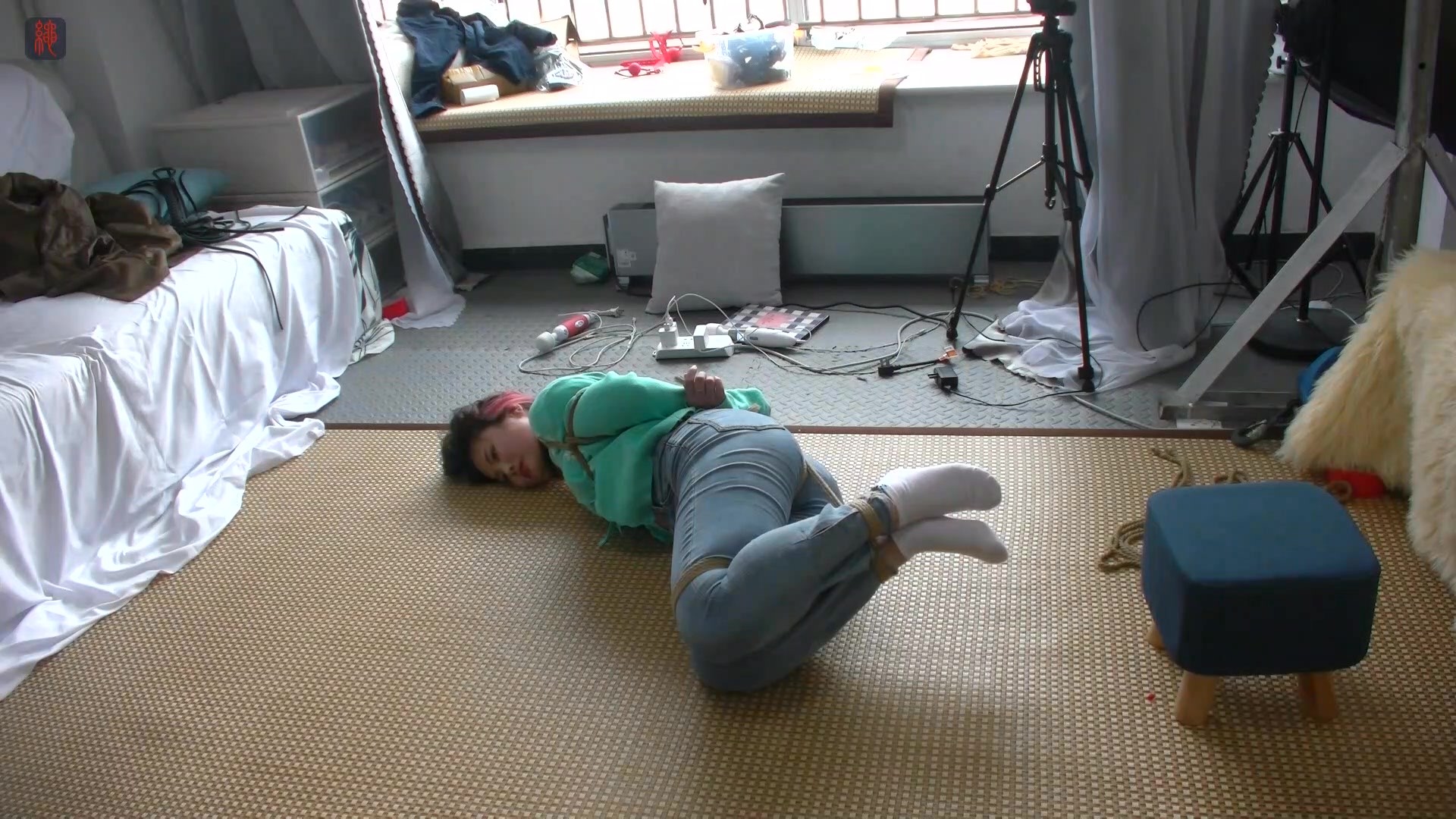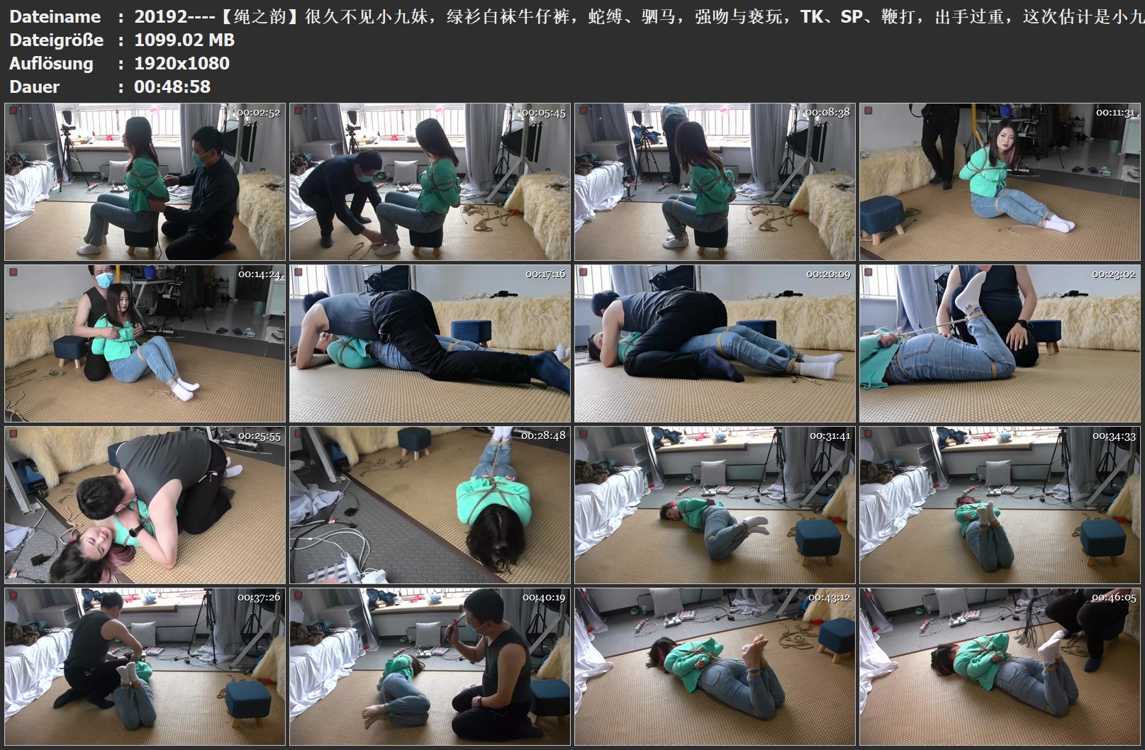 【绳之韵】很久不见小九妹,绿衫白袜牛仔裤,蛇缚、驷马,强吻与亵玩,TK、SP、鞭打,出手过重,这次估计是小九妹最后一次拍摄了