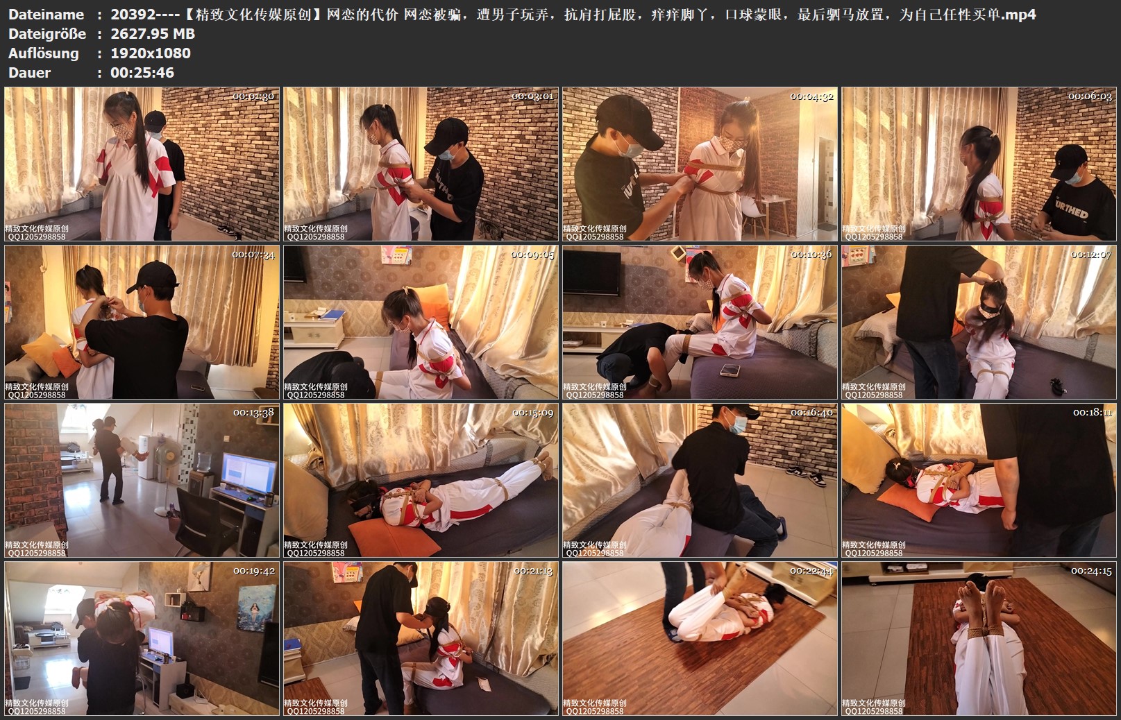 【精致文化传媒原创】网恋的代价 网恋被骗,遭男子玩弄,抗肩打屁股,痒痒脚丫,口球蒙眼,最后驷马放置,为自己任性买单