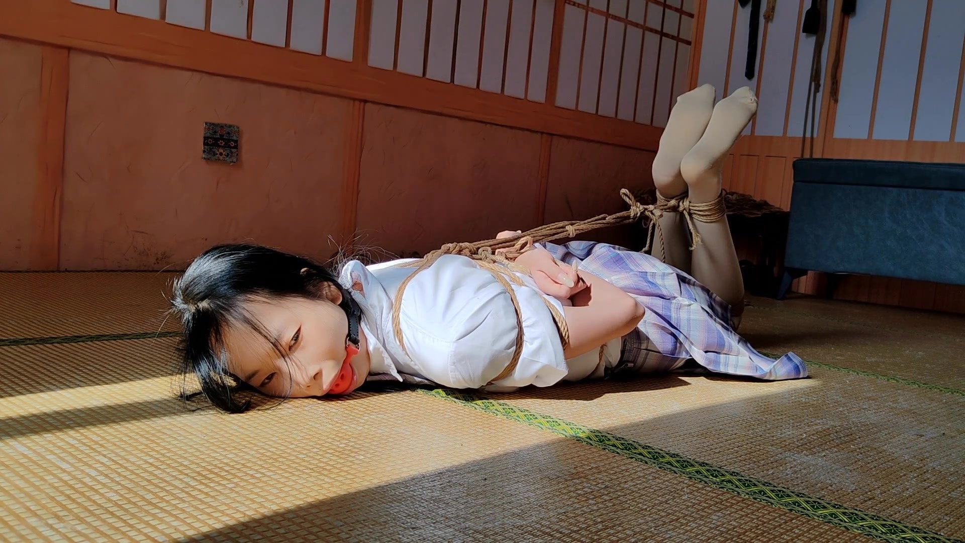 小英上课迟到,去到教室看见老师拿着绳子,便害怕的找理由想要逃走,被老师追上背后用毛巾捂住嘴,拖到教室强行捆绑,然后被绑上日式海老缚,嘴塞上大口球放置惩罚,又被老师回来劫财,被绑上腿后自己想要逃跑,到门口就被回来的老师看见,强行拖入,被绑上驷马,然后拍打逼问手机密码。并答应说出密码就放了她,小英被逼无奈只能说出密码,谁知坏人反悔了,重新塞上口球,便离开了