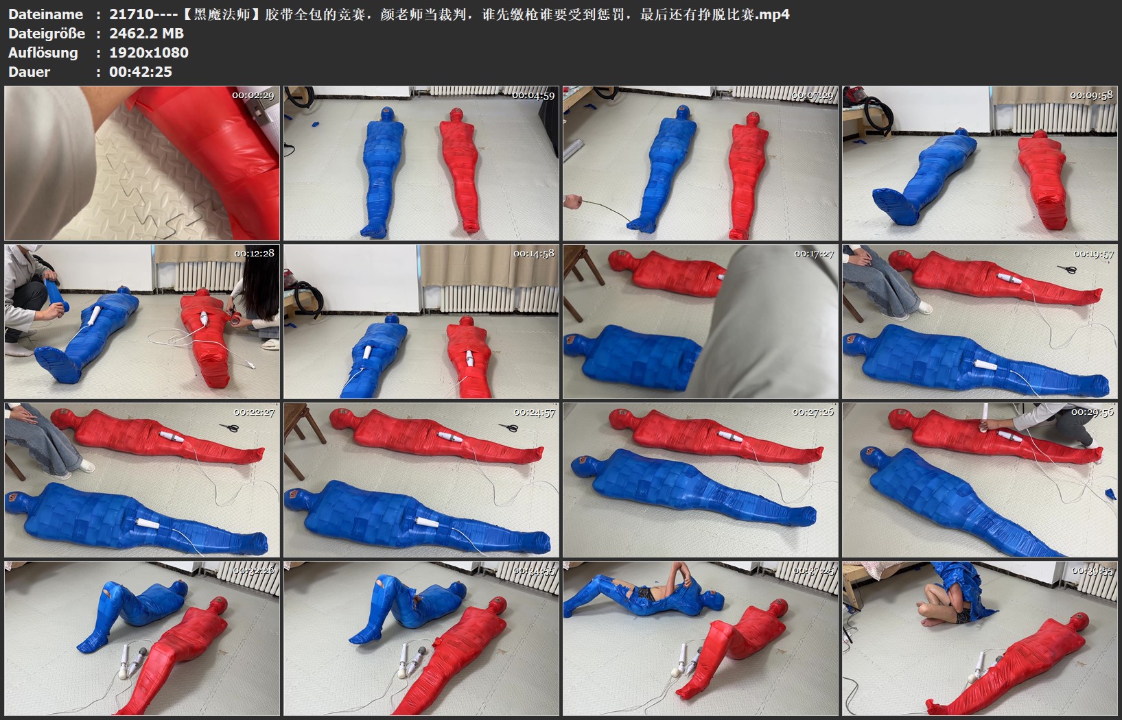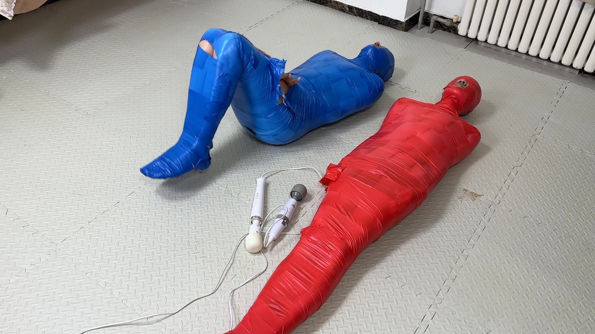 胶带全包的竞赛,裁判颜老师, 两位体验者被红蓝两种颜色的胶带全包束缚住,要经历两场比赛,第一场没人的丁丁上被固定了一个[X_X],谁先缴枪谁就输掉比赛,惩罚是输掉的人要把体验费给另外一个人,