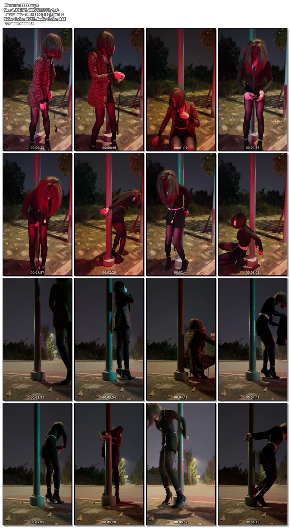 双脚已经锁上了脚镣 然后又通过牵引绳 连接了脚镣和项圈 这样站起来的时候 脖子被牵引绳拉住导致不能站直抬头 想要抬头就只能撅着屁股真的很羞耻 [X_X]的遥控器这次放在了外面 但双手从背后铐住之后 还是够不到遥控器
