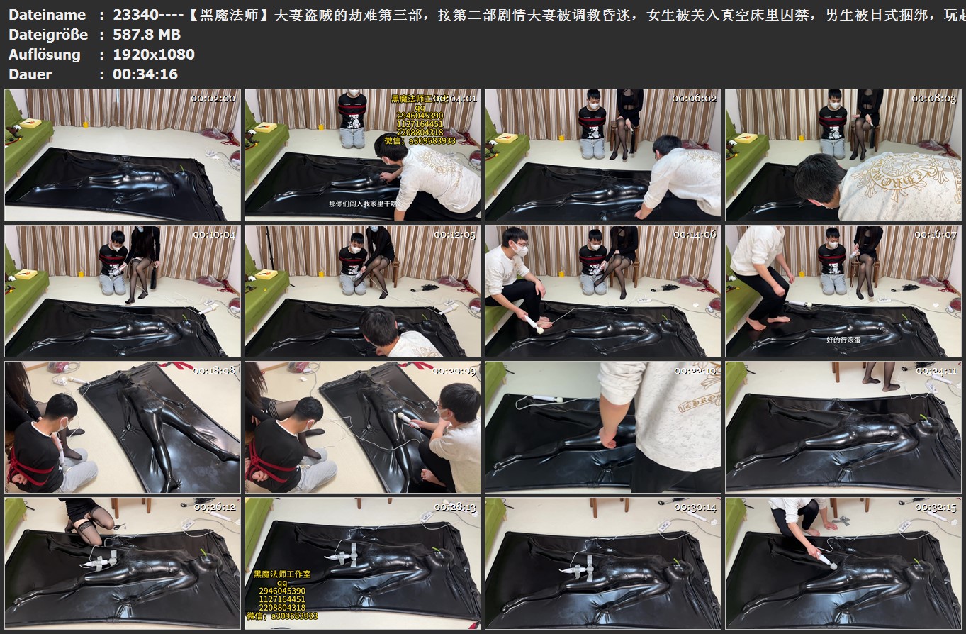 夫妻入室陷阱的第三部,接第二部剧情,女贼被乳胶睡袋抓住强制榨干了她所有的精力,然后夫妻盗贼双双昏迷,女贼被禁锢在了真空床里大腿敞开准备迎接新一轮的调教,男贼也被日式捆绑跪在了旁边被颜老师的脚踩着看着自己女朋友被黑胶禁锢被黑魔法师玩弄,玩了一会儿黑魔法师给这两个贼开出了条件,要求他们两人玩GC竞赛,两个人都会被AV棒刺激,谁先[X_X]谁就要留在这里。女生先被榨到了第一次,男友逃出升天!