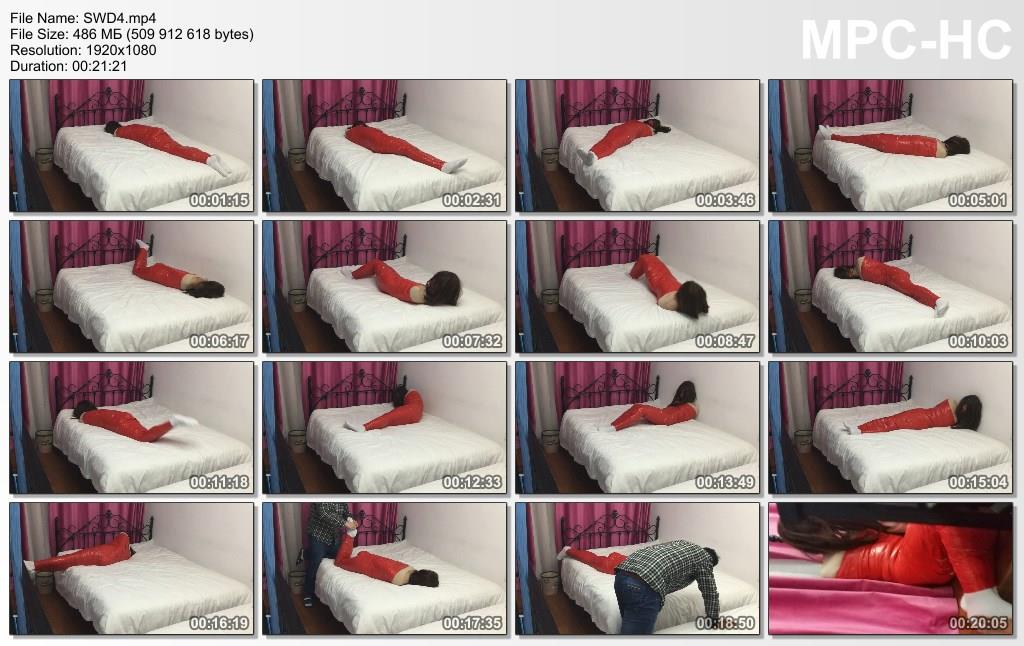 这次的视频直接进入正题,开头诺诺就被胶带捆成了一只红色的木乃伊,先穿上了连体的丝袜,再由肩膀往下一直包到脚腕,只露出了穿着白袜的脚丫(之后惨遭tk),嘴巴上也被封上了几层胶带,虽然不至于包得密不透风,但总体的拘束感还是灰常强烈的,根本没有挣脱的可能。最后的小花絮中诺诺还想尝试着在这种状态下下楼梯,结果证明还是想得太天真啦~