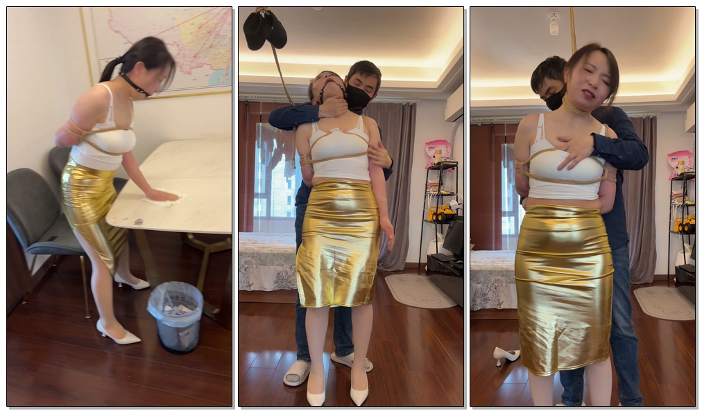 麦子身穿白色吊带和金色短裙,被一只手绳缚要求做家务,然后麦子又被吊缚脖子,使得麦子不能动弹,然后耳光50下最后脸已经红肿了