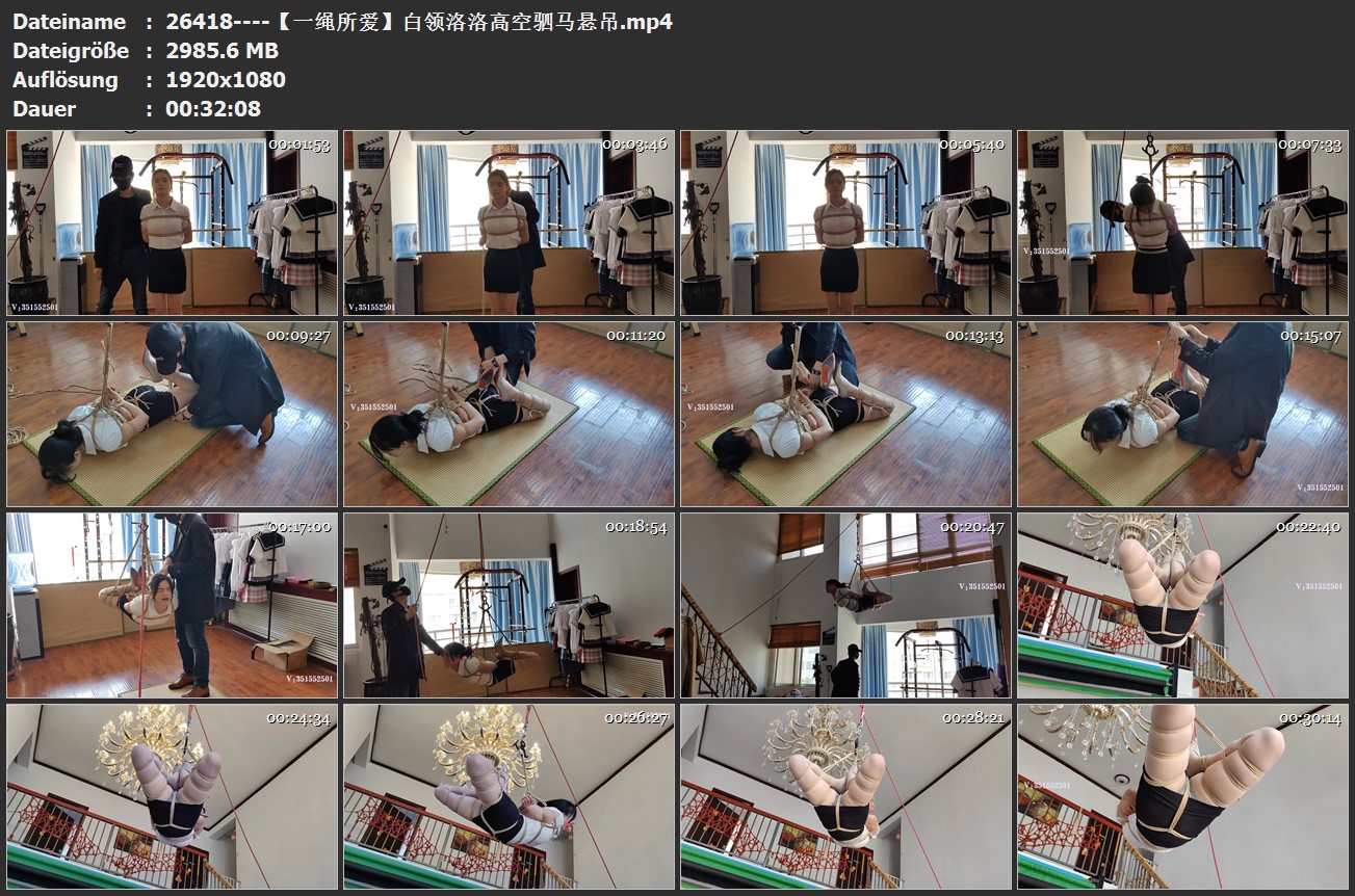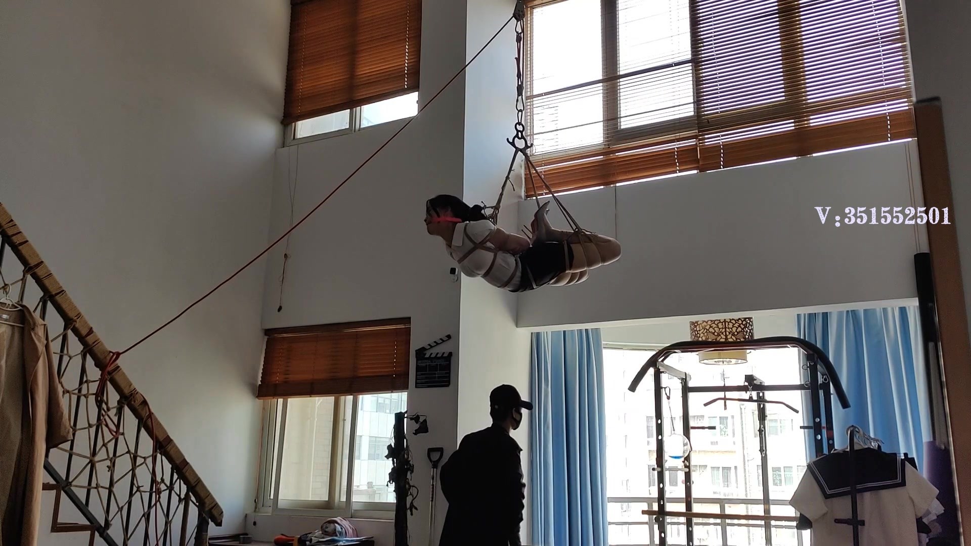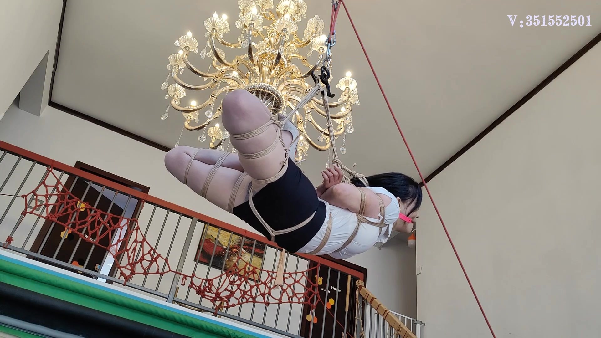 白领洛洛,职业装高跟鞋,全身捆绑 ,驷马捆绑,大号口球,驷马高高悬吊起来,吊到屋顶最高处,紧缚、恐惧、无奈、疼痛、刺激、哀嚎、兴奋席卷全身,还伴随着老师的欺辱。在高高的屋顶悬吊着放置,无期的等待与折磨