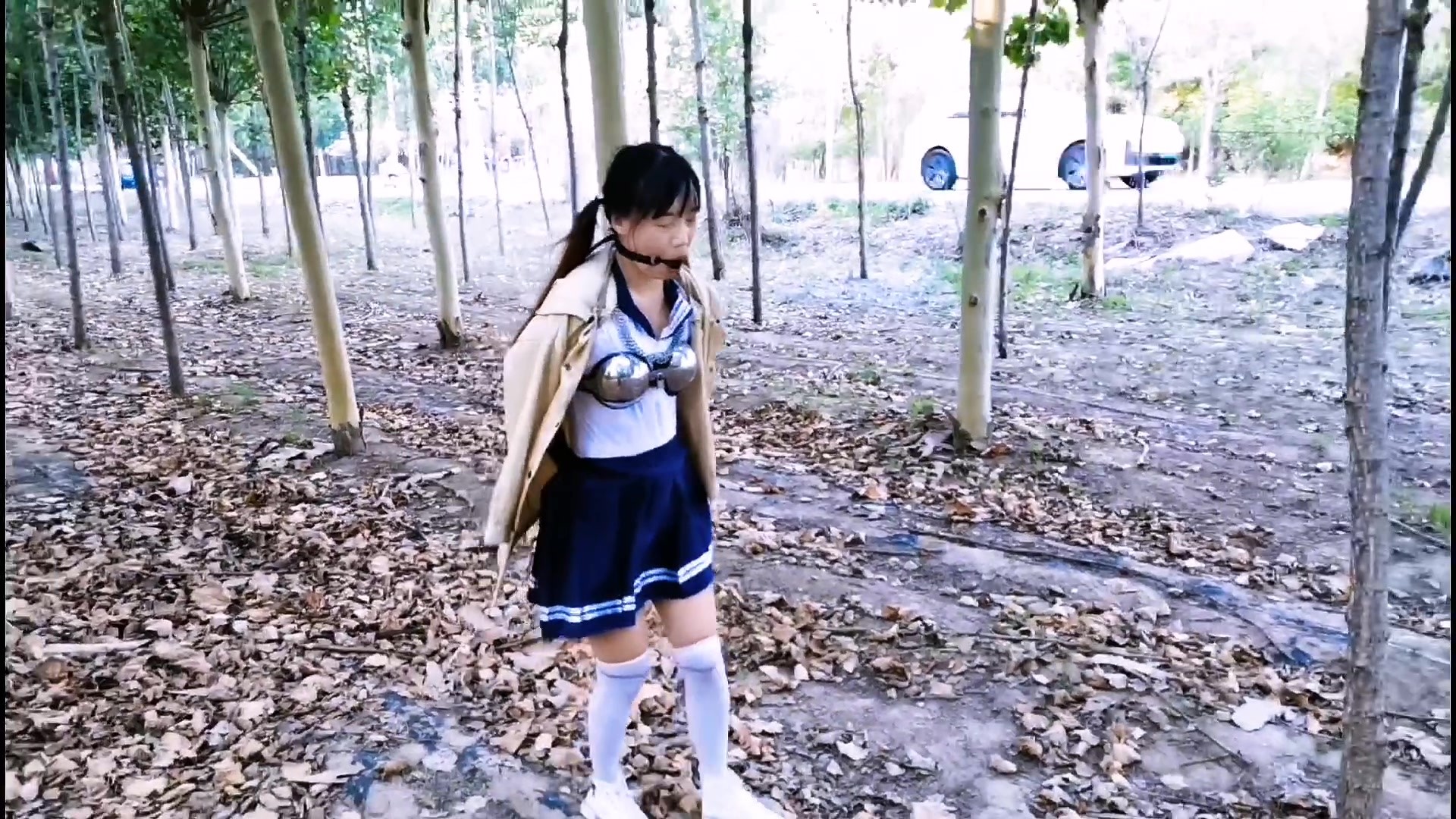 大学生急着去上学,正好遇到一辆车路过,并举手让车停下,司机见是飘亮大学生,赶紧停车让她上来,上车后大学生随意喝了几口水,殊不知司机做了手脚,竞然喝下去的是迷情水,喝了水以后,非常听话,正中司机套路,随后把她拉到密屋,看到贞操工具急忙脱下内裤穿起来,带上y具口球,随后被司机绑起来寻找户外刺激,刚到小树林遇到放羊的农夫,竞然不害怕,又朝着狗走过去,穿着这个模样,把狗都吓的赶紧躲开,她越玩越有兴趣,又走到路边继续闲逛,逛累了被司机绑到树上,司机走到她面前,把人工火腿塞进她嘴里,让她好好享受享受一番