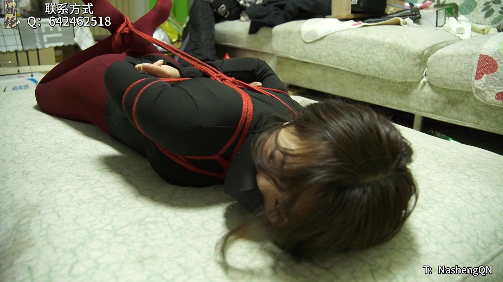 【娜绳工作室】【青柠】黑色丝袜,双手被反绑在身后,高高吊起,无法触及自己的腰部
