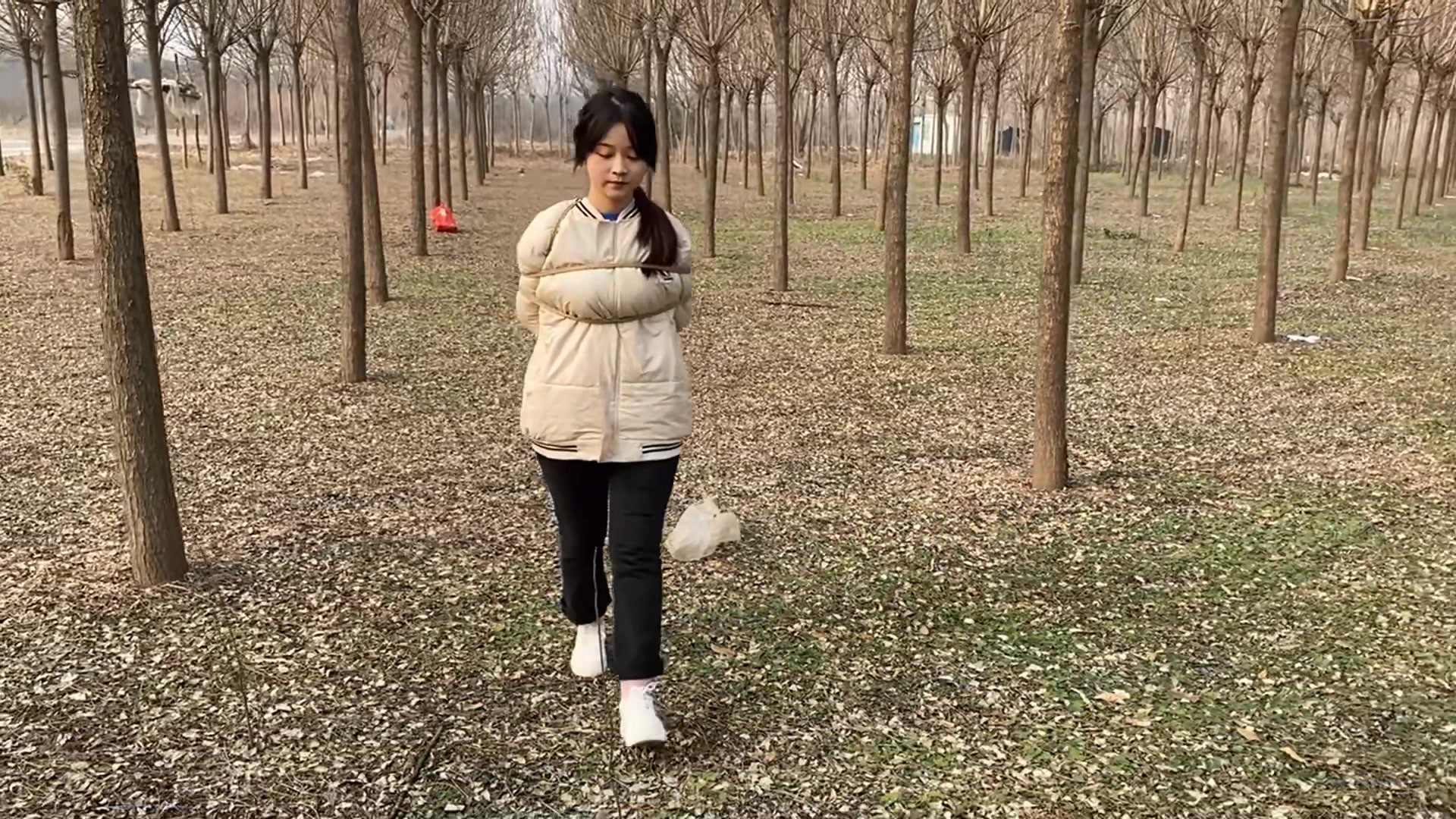 白天的户外小树林里,身着日常服装的模特需要被捆着把散落在各处的瓶子捡回来,每捡到一个瓶子都会增加拘束。