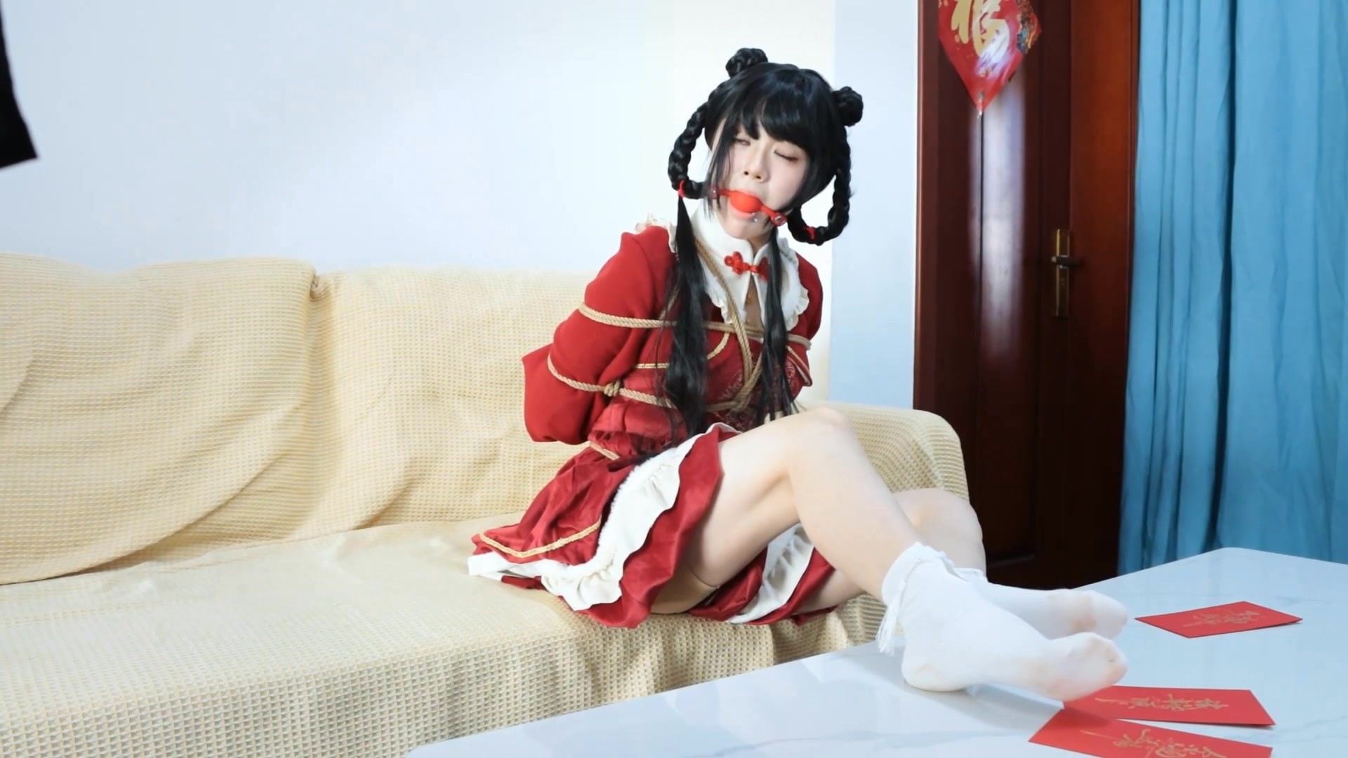 4号红包:姿势升级:梦尘被绑成特殊姿势,并在挣扎过程中用脚寻找地上的三枚硬币,只要用脚碰到,然后通过呜呜声来回报即可算1次成功。