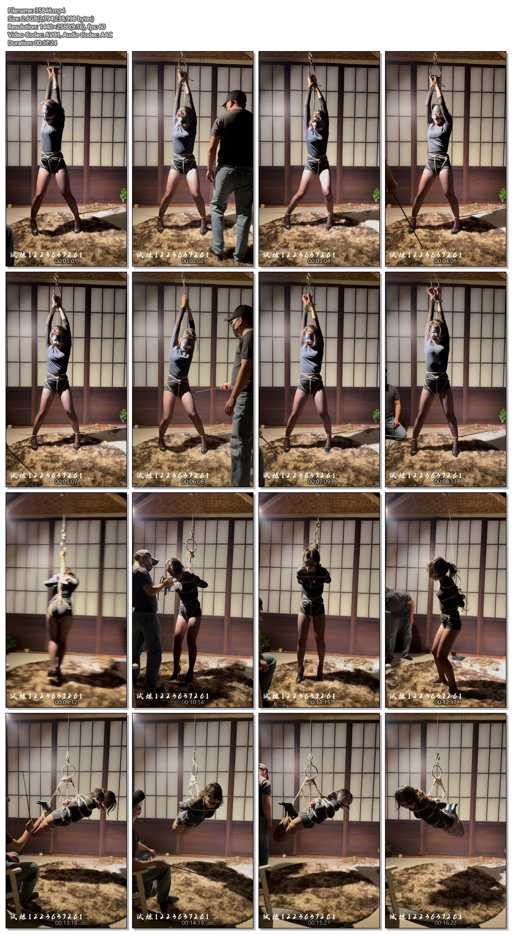 这期视频主角小欣穿上黑丝套装和10厘米的性感高跟鞋,双手举起来依靠升降器直接吊起,双脚分开分别用绳拉住无法并拢,没被吊过的小欣痛苦挣扎,嘴里被塞进去了超大口球只能呜呜呜。有一个很有意思的片段是把她放下来的时候她说自己可以解开手上的绳子,我说你试试吧不过要倒计时我会慢慢升起来,最终解脱成功还是失败?还有两个驷马吊缚的片段,发现过年回来小欣的耐力提升了不少,看来可以解锁更多的姿势了