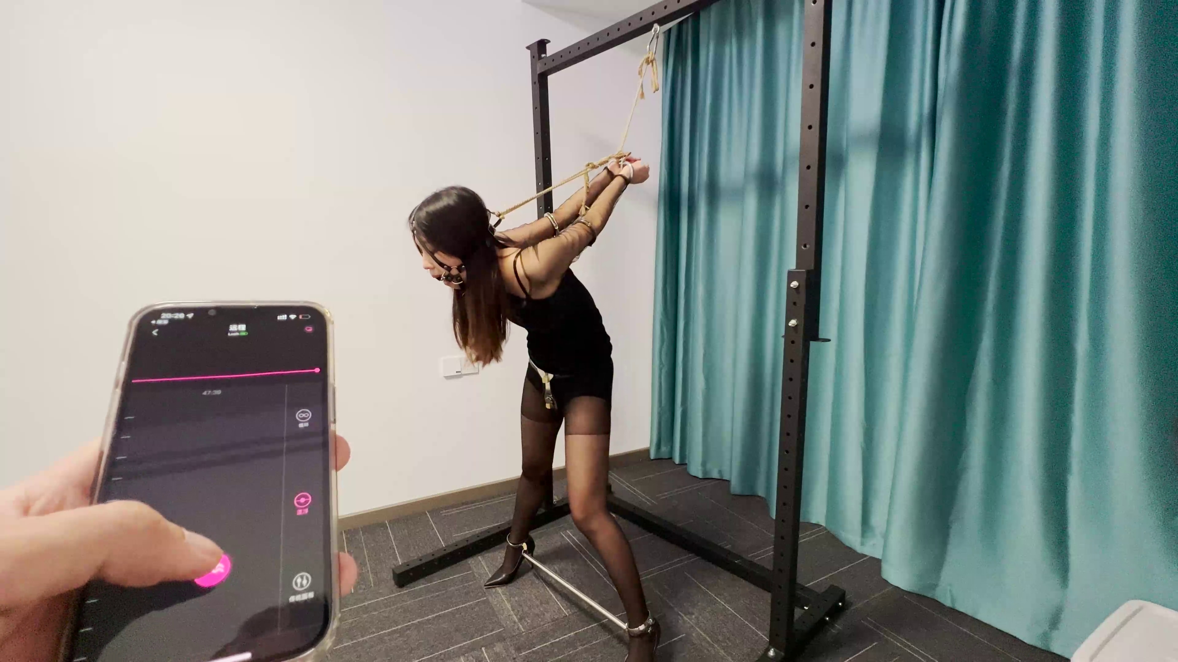 吊架第一集 直臂反吊+TD+贞操带+分腿器,马具口球反吊,绳子拉头,头不能低下,马具的口球是空心的口水直流。后戴上口枷。遥控TD放入手机控制,锁上贞操带