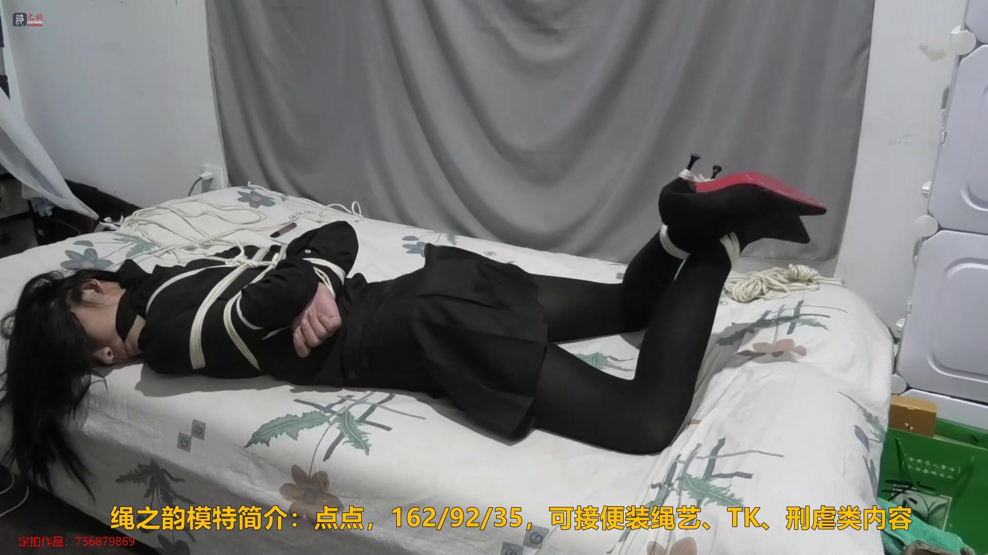【绳之韵】娇俏小助理黑丝OL、黑丝裤袜、细高,定拍宣传片:日式紧缚、布条勒嘴,室外押解行走、床上交叉脚腕驷马捆绑、挣扎