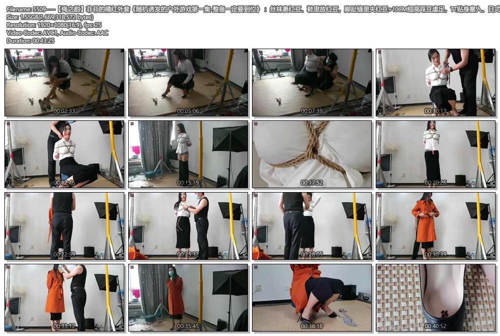 【绳之韵】菲菲的橘红外套《随机诱发的户外游戏第一集-整备一定要到位》:丝袜裹红豆、鞋里放红豆,脚趾缝里夹红豆+10CM细高踩豆虐足,TT贴身塞入、日式胸缚,漂亮外套腰带的捆绑功能