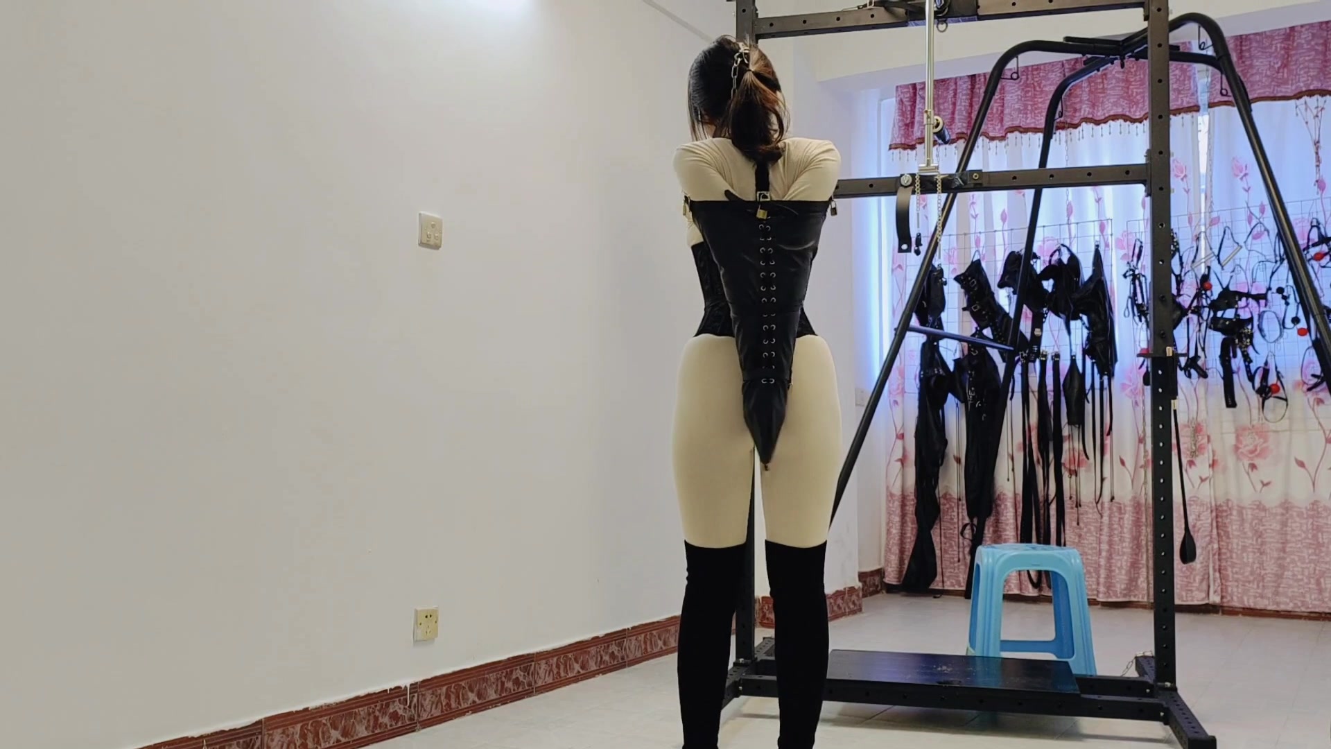 重金属拘束架系列,服饰:连体紧身衣+12厘米过膝长筒靴+超紧束腰带+真空;拘束姿势:单手套分腿站立禁锢;刑具:马具双环超大口枷入式木奉、单手套、紧咬型鸭嘴浮夹、一字型脚枷固定震动木奉、锁头、铁链、大型拘束架;内容:戴上单手套并用锁头锁住,把m的脖子用脖环锁死在拘束架的横杆上,双环马具型口枷强入木奉,辱头被辱夹锁紧连接木奉,下面双脚被一字型脚枷强行分开中间固定木奉直顶敏感点强高,加各种摸+鞭+捏+调戏+虐