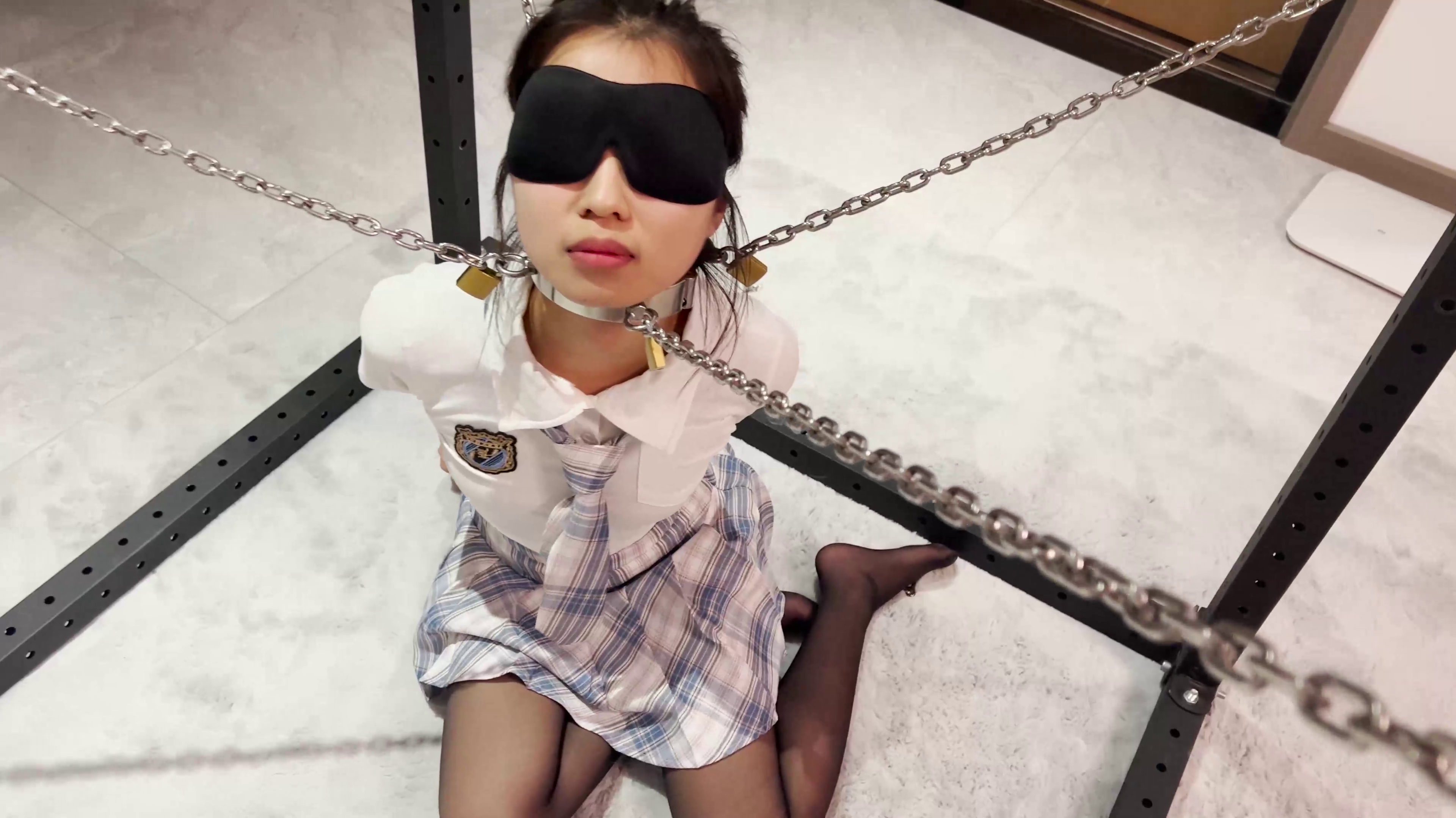 用4根铁链锁住涵涵的脖子让涵涵不能移动一点点,再用手铐铐住肘关节和手腕,脚铐固定,脚和大腿用铐 铐到一起再用快乐棒让涵涵舒服。