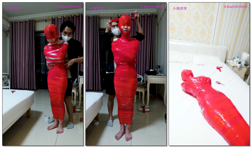 这是一个全过程的全包胶带木乃伊~加挣扎调教。先用保鲜膜裹好全身,再用胶带慢慢的全部包上,把露出的地方全部补上,因为包了太久,小萌的手腕麻了,所以才放了她。看了个别作品重新包木乃伊,用了几种不同的胶带,效果还行~