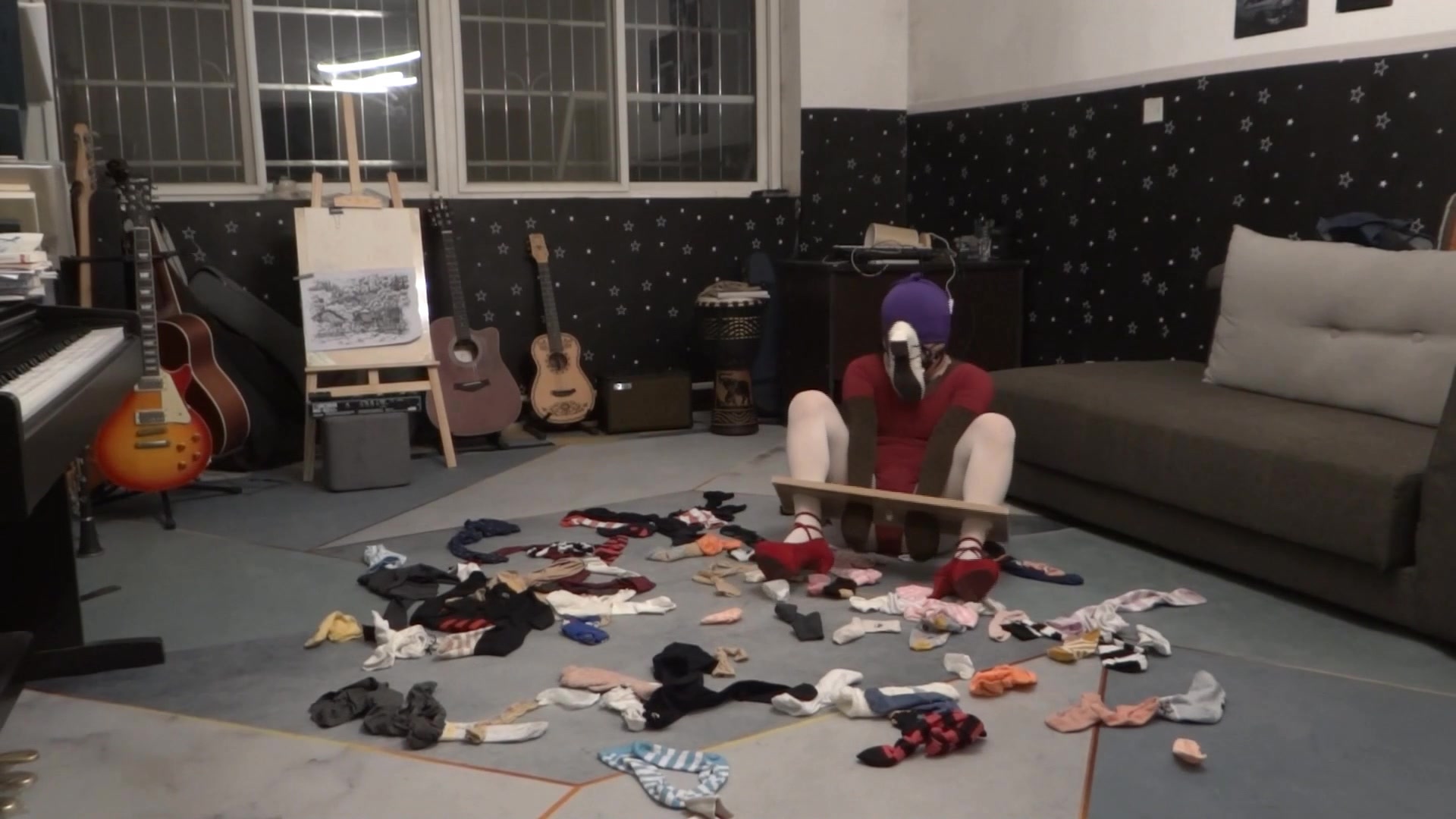 这次问一个大二的妹子朋友要来了一双穿了一个夏天和秋天的鞋子,和另一个妹子的几双冬天穿过了的袜子,一双袜子塞进嘴巴里用口球堵住,另一只袜子塞到妹子的臭鞋子里,用绳子固定在脸上,鼻子上还带了个鼻勾,只能强制闻妹子鞋子里的味道,地上扔的都是之前问妹子要来的袜子,木枷的钥匙在脚上的高跟鞋里,高跟鞋锁的钥匙在放在沙发上,要先爬到沙发上脱下高跟鞋才能解开木枷,身下塞了四个跳弹,充电宝挂在体操服的裆部,地上扔的都是之前问妹子要来的袜子最后因为双手双脚都被绑在一起了,没办法爬到沙发上去,挑战失败。